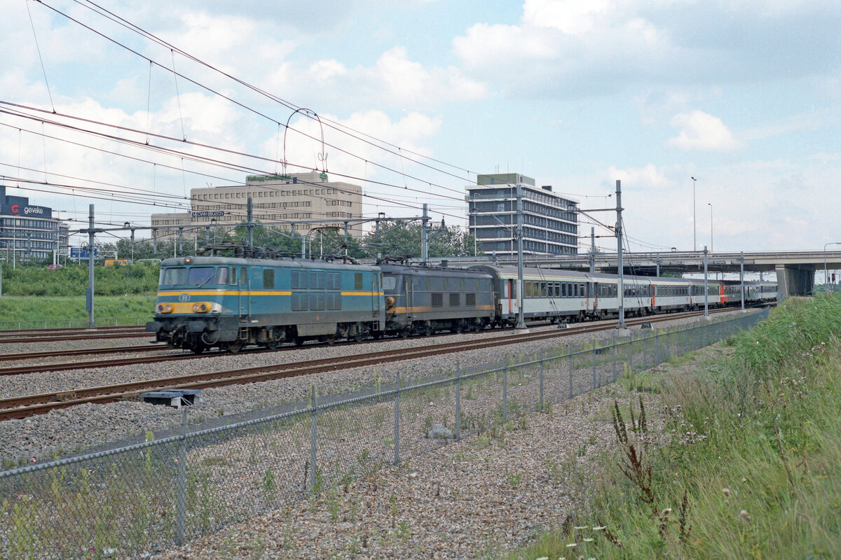 NMBS 1504 mit TEE-82 "Etoile du Nord" (Amsterdam CS - Paris Nord) bei Ankunft in Roosendaal am 14.08.1983. Wagen typ INOX der SNCF. Scan (Bild 3761, Kodacolor400).