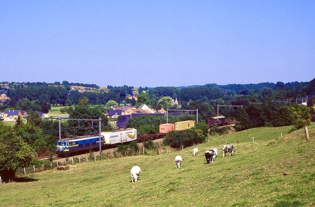 Scanbild: Leererzzug mit 2355 an der Spitze durchfahrt am 16 Mai 2002 Antwerpen-Dam. Ab 2012 ist dieser haltestelle geschlossen.