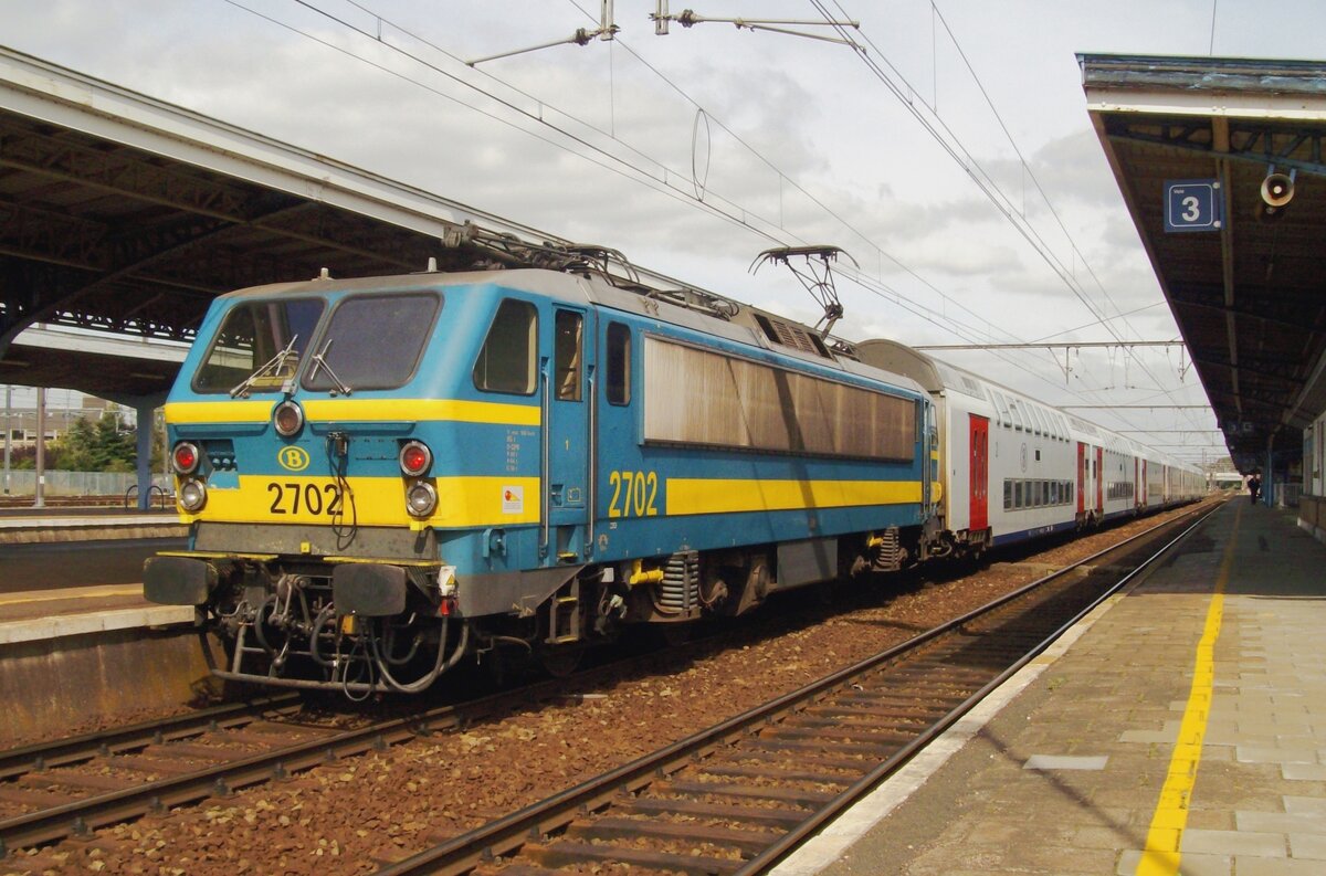 Scanbild: am 17 Mai 2002 treft NMBS 2717 mit ein Piekuurtrein (Spitzverkehrszug) aus Schaerbeek in Brussel Noord ein.