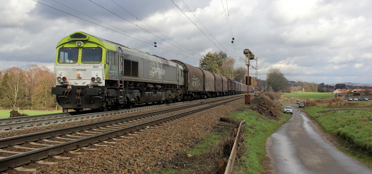 Die Class 66 6603 von Captrain fährt jetzt für Railtraxx kommt mit viel Dieselpower die Gemmenicher-Rampe hochgefahren aus Richtung Aachen-West mit einem schweren gemischten Güterzug aus Linz Voestalpine(A) nach Antwerpen Waaslandhaven(B) und am Ende fährt 185 510-5 von Railtraxx als Schubhilfe bis zum Gemmenicher-Tunnel.