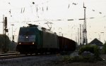 Die Class 66 DE6312 "Alix" von Crossrail fährt mit einem sehr langen Containerzug von Aachen-West nach Belgien, am Ende ist eine 145 CL-031 von Alpha Trains und auf dem Nebengleis steht die Class 66 PB20 von Railtraxx BVBA bei Viele Wolken am 13.3.2012.