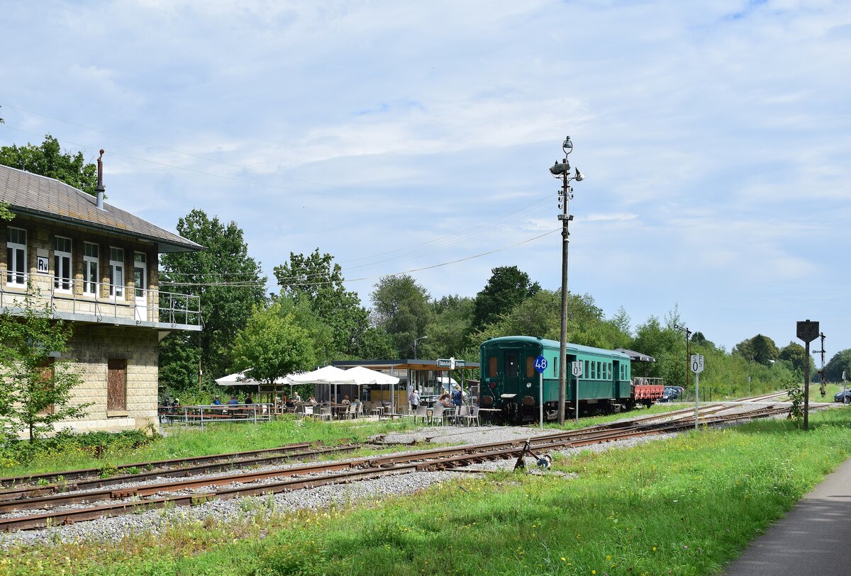 Das Bahnhofsgebäude mit Güterschuppen an der Vennbahn in Raeren/Belgien, im aktuellen Zustand vom 23.Juni 2015. Gelände ist frei zugänglich.