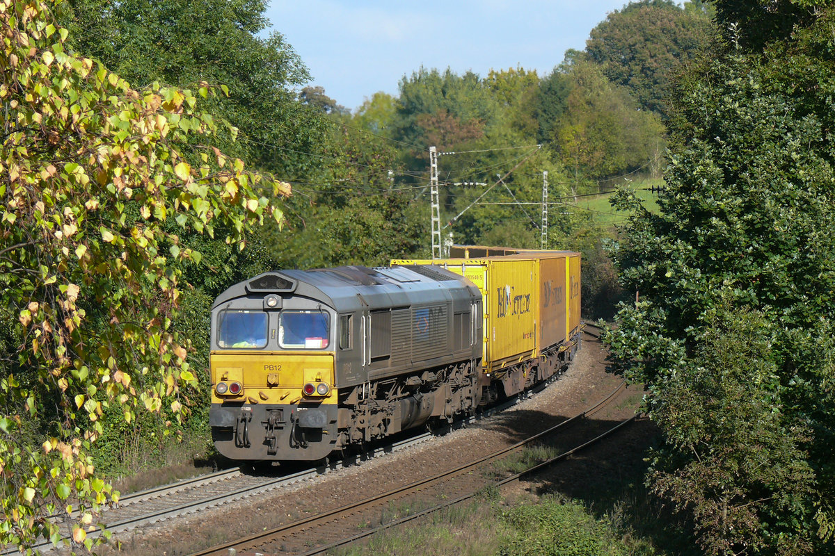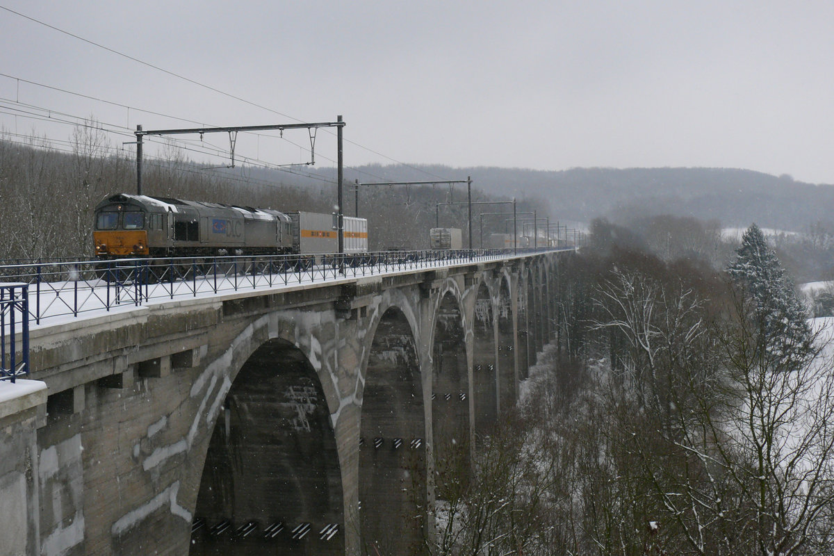 Die Class 66 DE6309 von DLC Railways steht in Montzen-Gare(B) startbereit mit einem sehr langen P&O Ferrymasters Containerzug, am Zugende ist eine Class 66 DE6306 von DLC Railways bei Nebel am 6.1.2013.