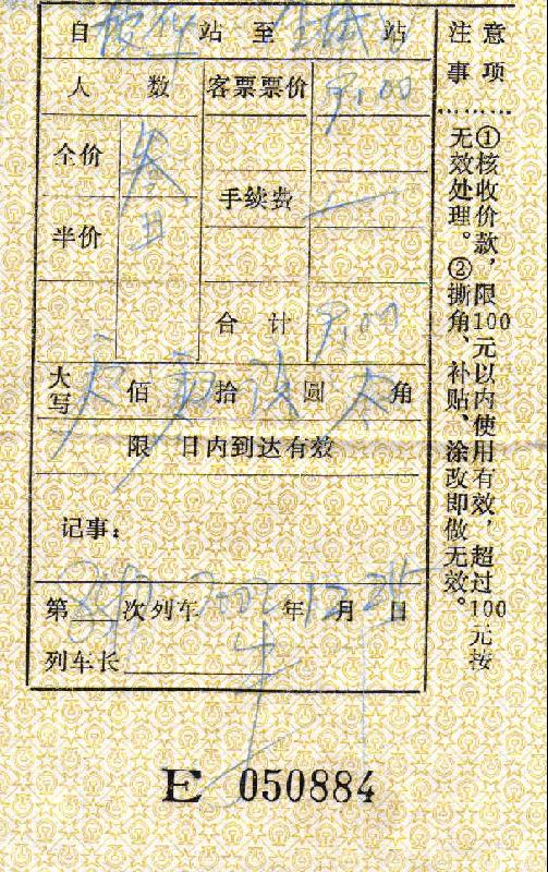 Ticket D0083715, von Beijing (Nord) nach Chifeng, Zug-Nummer 1457, verläßt Beijing am 23DEC2001 um 19:19, Wagen 9, (Hard-Sleeper) Liege Nr. 16, Mitte, Preis 75 Yuan - Ticket F064268, von Chifeng nach Shenyang, Zug-Nummer K650, verläßt Chifeng am 28DEC2001 um 21:05, Wagen 13, (Hard-Sleeper) Liege Nr. 19, Unten, Preis 95 Yuan - Ticket A005516, von Harbin nach Beijing, Zug-Nummer T72, verläßt Harbin am 02JAN2002 um 17:11, Wagen 10, (Soft-Sleeper) Abteil 23, unteres Bett, Preis 442 Yuan - nicht ganz 50% des Preises für ein Flugticket mit Air China für die gleiche Strecke.