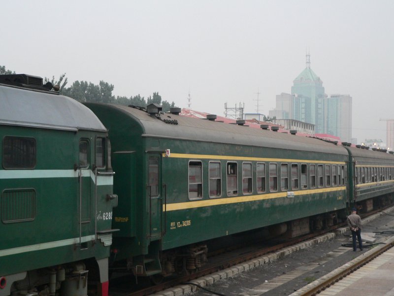 Wagen eines chinesischen Schnellzuges. Sie scheinen luftgefedert zu sein. Auf einer Wagenseite sind jeweils 4 Sitze, auf der anderen 6. Die Sitzbänke sind gepolstert, die Rückenlehnen aber senkrecht angeordnet. Höchstgeschwindigkeit: 120 km/h. 13.9.2007, Peking Nordbahnhof (Xizhimen)