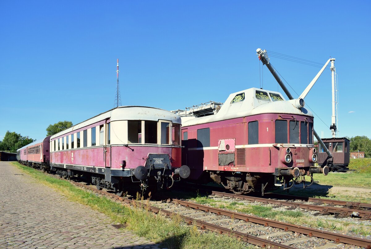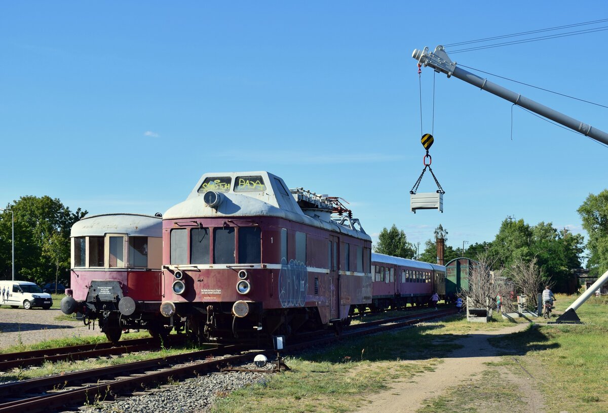 Blick auf 195 603-6 sowie den TVT 188 001 bzw 708 001. Er wurde 1956 von dem VEB Waggonbau Görlitz gebaut. Heute steht er im Magdeburger hafen und gehört den Magdeburger Eisenbahnfreunde e.V.
