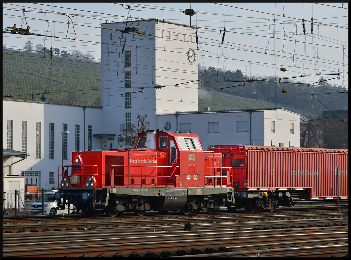 Der Würzburger Tunnelrettungszug (TRZ) am 08.03.2026 bei seiner sonntäglichen Bewegungsfahrt im westlichen Gleisvorfeld des Hauptbahnhofs. Standardmäßig sind zwei Lokomotiven der Baureihe 714 an diesem Spezialzug. Hier die Lok 714 107 (NVR: 9980 9 170 007-5 D-DBMP), am anderen Ende arbeitet ihre Schwester 714 109 (NVR: 9980 9 170 009-1 D-DBMP)