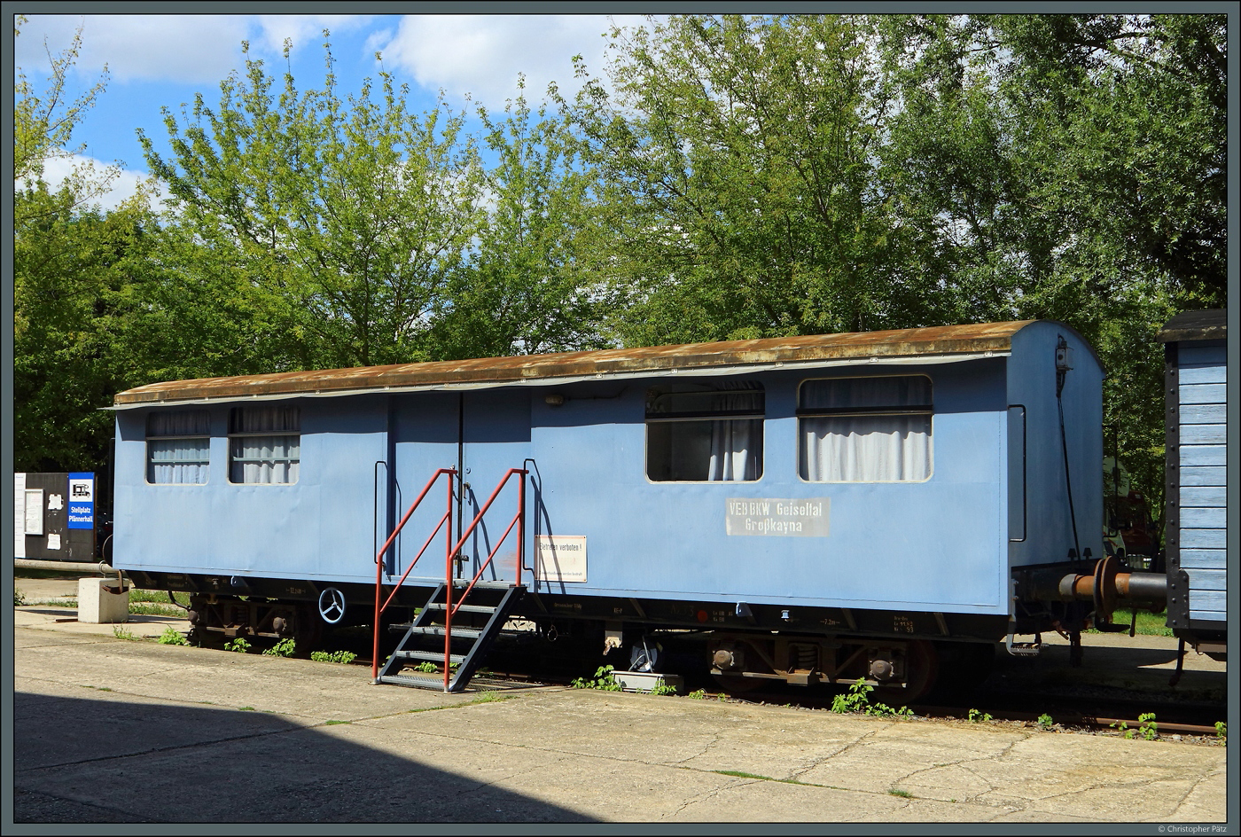 Ein zum Gerätewagen umbebauter alter Personenwagen Mitte September 2019 im Eisenbahnmuseum Heilbronn.