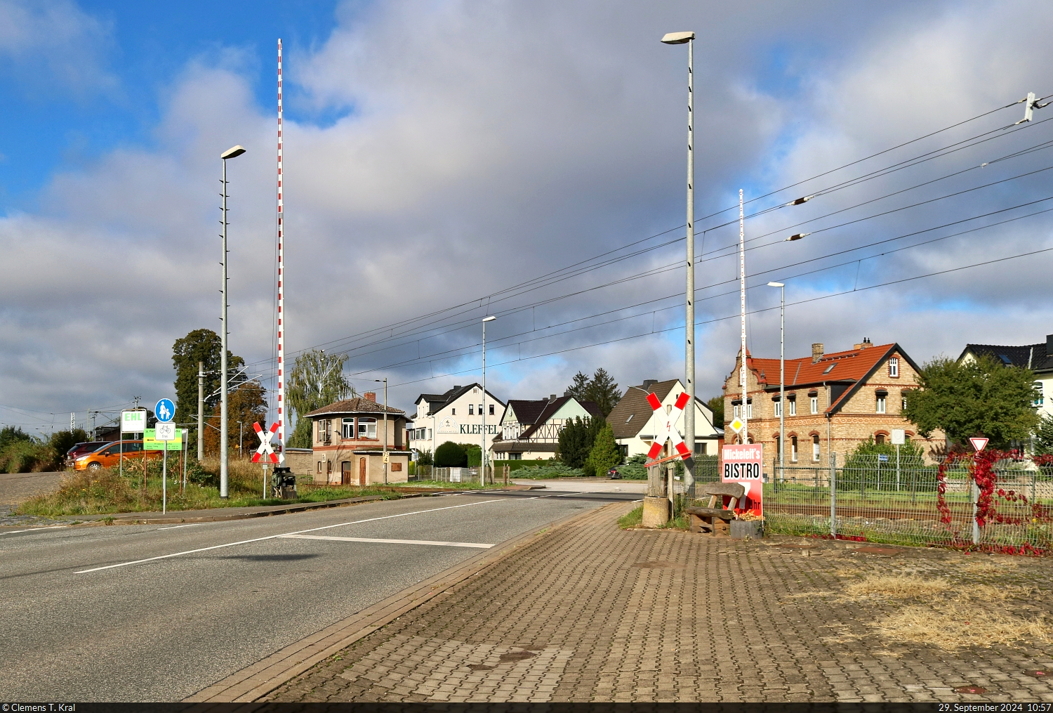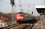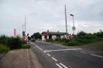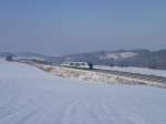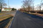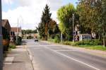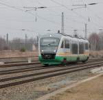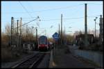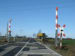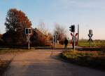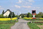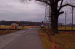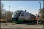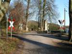 Bei der Ausfahrt aus dem Bahnhof Großschönau überquert VT 05 der Vogtlandbahn einen mit einer Haltlichtanlage der Bauform HL-64b gesicherten BÜ. Der Zug fährt als Trilex über Zittau nach Reichenberg/Liberec. (3.3.2012)