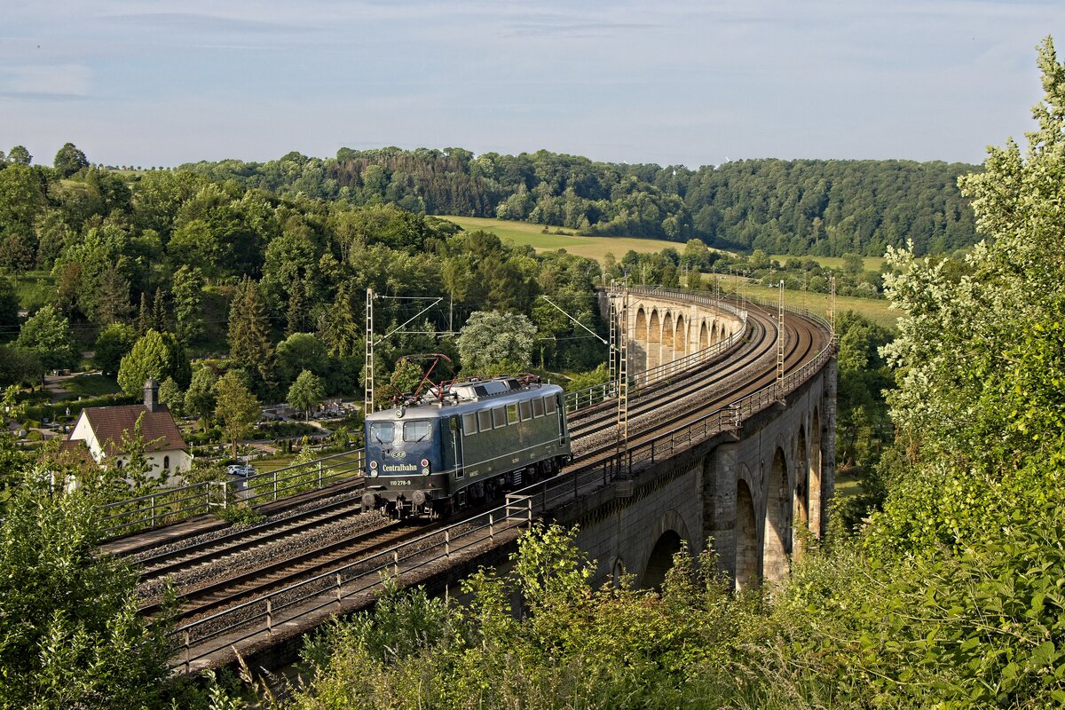 Die Eisenbahn von Kassel ins Ruhrgebiet durchquert auf ihrem Verlauf das Eggegebirge. Bei Altenbeken entstand dabei der Beketal-Viadukt. Links am Bildrand führt eine Bügelfalten-110 einen Zug der Relation Kassel - Ruhrgebiet.