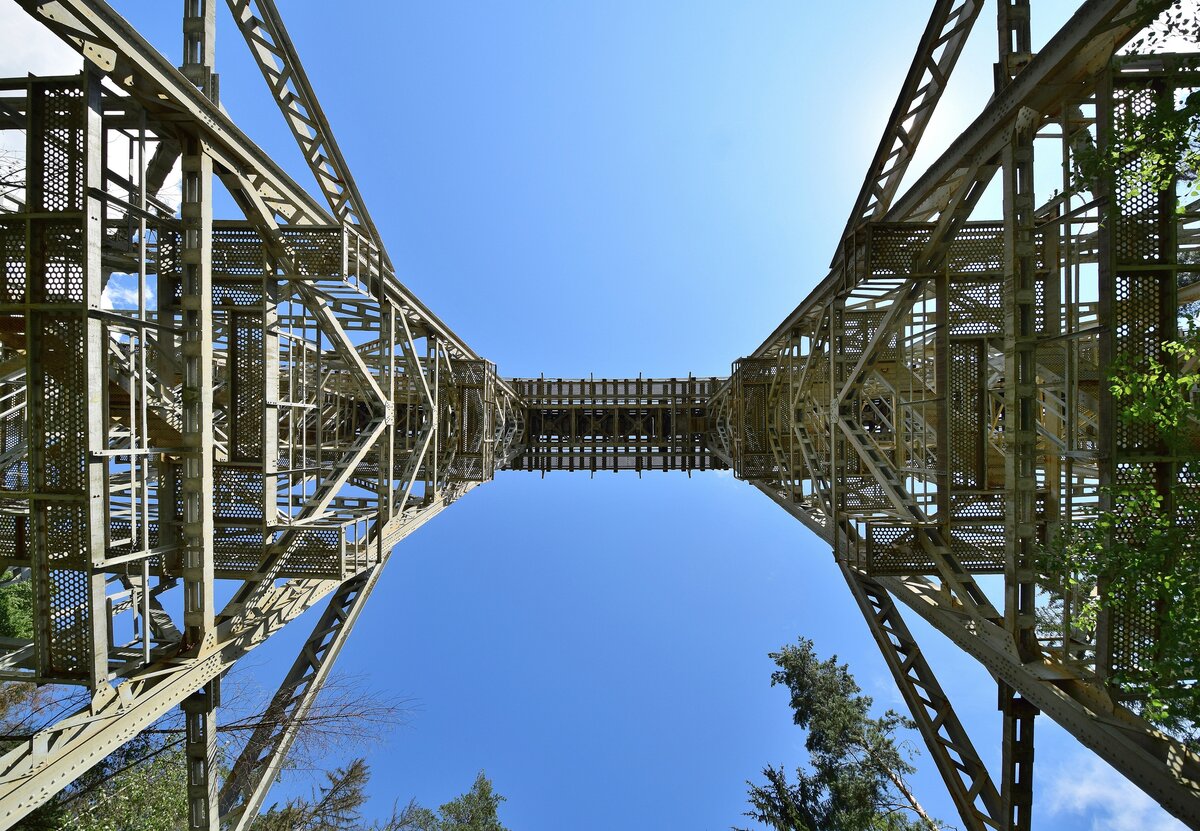 Blick von unten. Ein Blick vom Wanderweg nach oben auf die Ziemestalbrücke. 1893 bis 1895 erbaut hat sie eine Länge von 115 Metern und eine Höhe von 32 Metern sowie einen Bogenradius von 193 Metern. Besonders auffällig ist hierbei das man nicht wie sonst oft üblich Stein sondern Stahl als Baustoff genommen hat. Dies war unterem anderem auf die hohen Transportkosten in Ziemestal zurück zu fähren weshalb man sich für den modernsten Baustoff zu damaliger Zeit entschied und zwar Stahl. Der Personenverkehr wurde am 24. Mai 1998 eingestellt und der Güterverkehr wenige Monate später Ende 1998. Seit dem 1.1.2005 ist die Strecke offiziell stillgelegt. Seit vielen Jahren rollen nun nur noch Draisinen über die denkmalgeschützte Ziemestalbrücke.