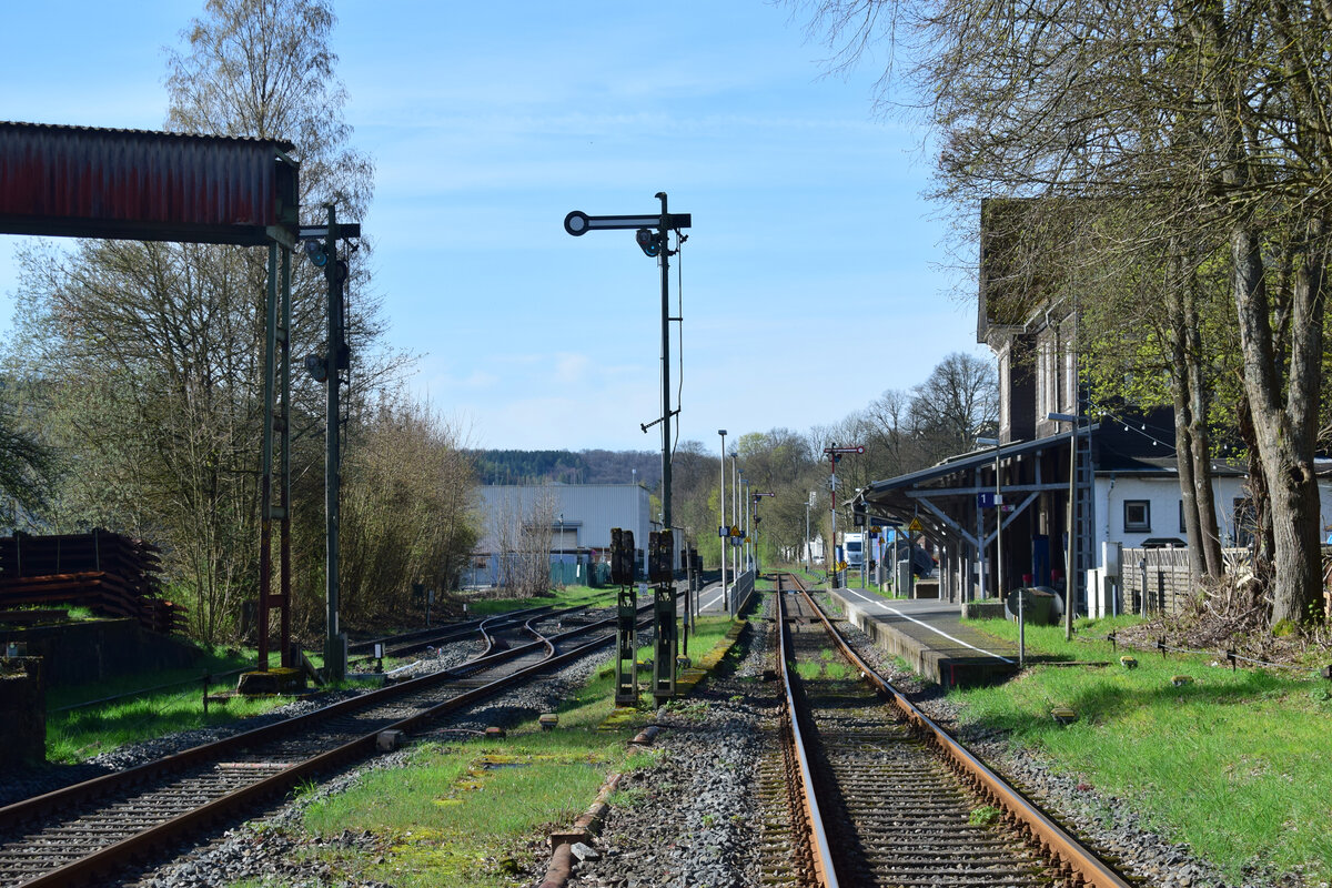 Blick über den Bahnhof Blumenberg. Einst ein Knotenpunkt mit 4 Strecken dient Blumenberg heute lediglich der Zugkreuzung. Mit der Streckenertüchtigung auf 120km/h 2021 werden die Bahnsteige abgerissen und der Bahnhof auf ESTW umgebaut.