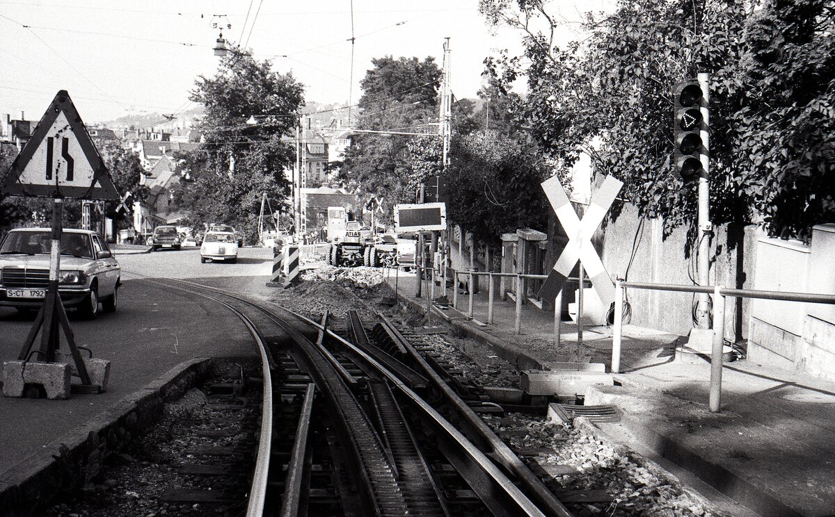 SSB Stuttgart__Gleisbau__Seit dem Sommer 2025 bis ins Frühjahr 2026 verlängern die SSB im südlichen Stadtbezirk Heslach die drei noch fehlenden Stadtbahn-Haltestellen auf 80 Meter. Damit kann die stark frequentierte U1 auf ihrer Strecke von Fellbach nach Heslach auch mit 80-Meter-Zügen (2 Doppeleinheiten S-DT8) verkehren. Auch vor 50 Jahren wurde dort gebaut, Gleise neu gelegt,anschließend Kettenfahrleitung installiert etc. Im Bild Begegnung vorm Bihlplatz: Linie 1 mit GT4 727 nach Heslach mit Linie 15 von Vaihingen mit GT4 444+613.__04-1974 Klaus-Erich Lisk