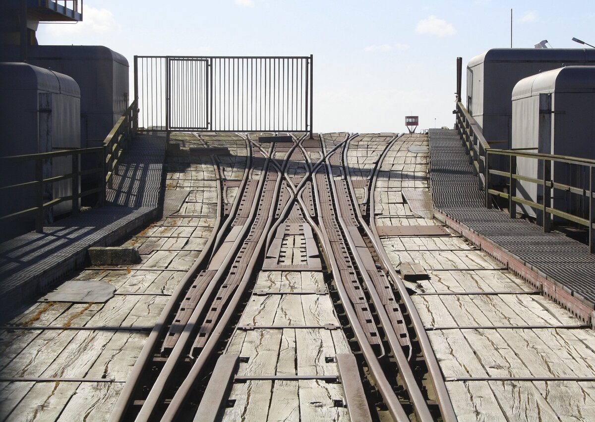 Fächerweiche | Gleisende am rechten (vom Glasbahnhof aus gesehen) Fährbett im Stadthafen Sassnitz. Der Bahnhof Sassnitz Hafen diente zuletzt ausschließlich dem Fährbetrieb Richtung Trelleborg. Wegen des Platzmangels war zur Bedienung der beiden Fährbetten eine weitere Spitzkehre erforderlich. Aufnahme vom März 2014