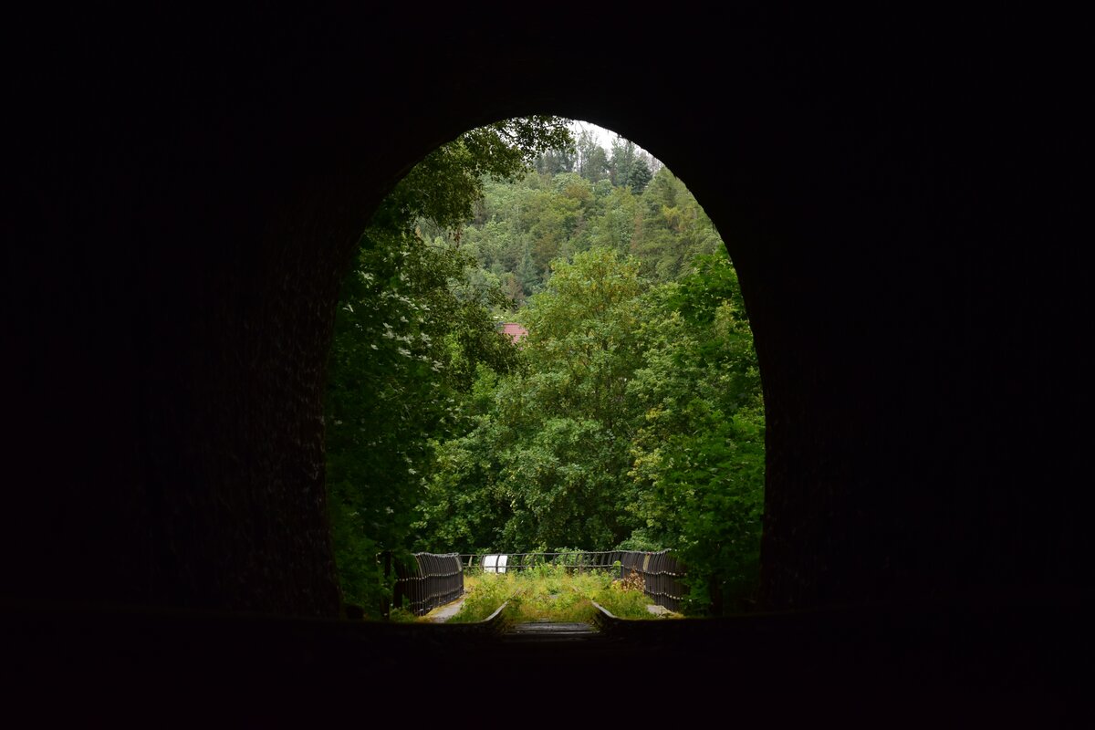 Blick aus dem Hemmkoppentunnel auf den Saale Viadukt bei Ziegenrück. Der Tunnel wurde 1893/94 erbaut. Der Personenverkehr wurde am 24. Mai 1998 eingestellt und der Güterverkehr wenige Monate später Ende 1998. Seit dem 1.1.2005 ist die Strecke offiziell stillgelegt.