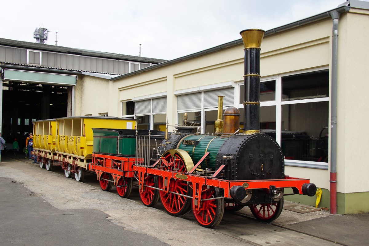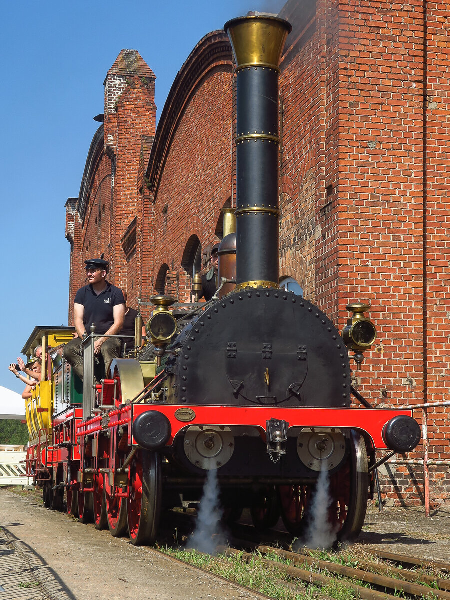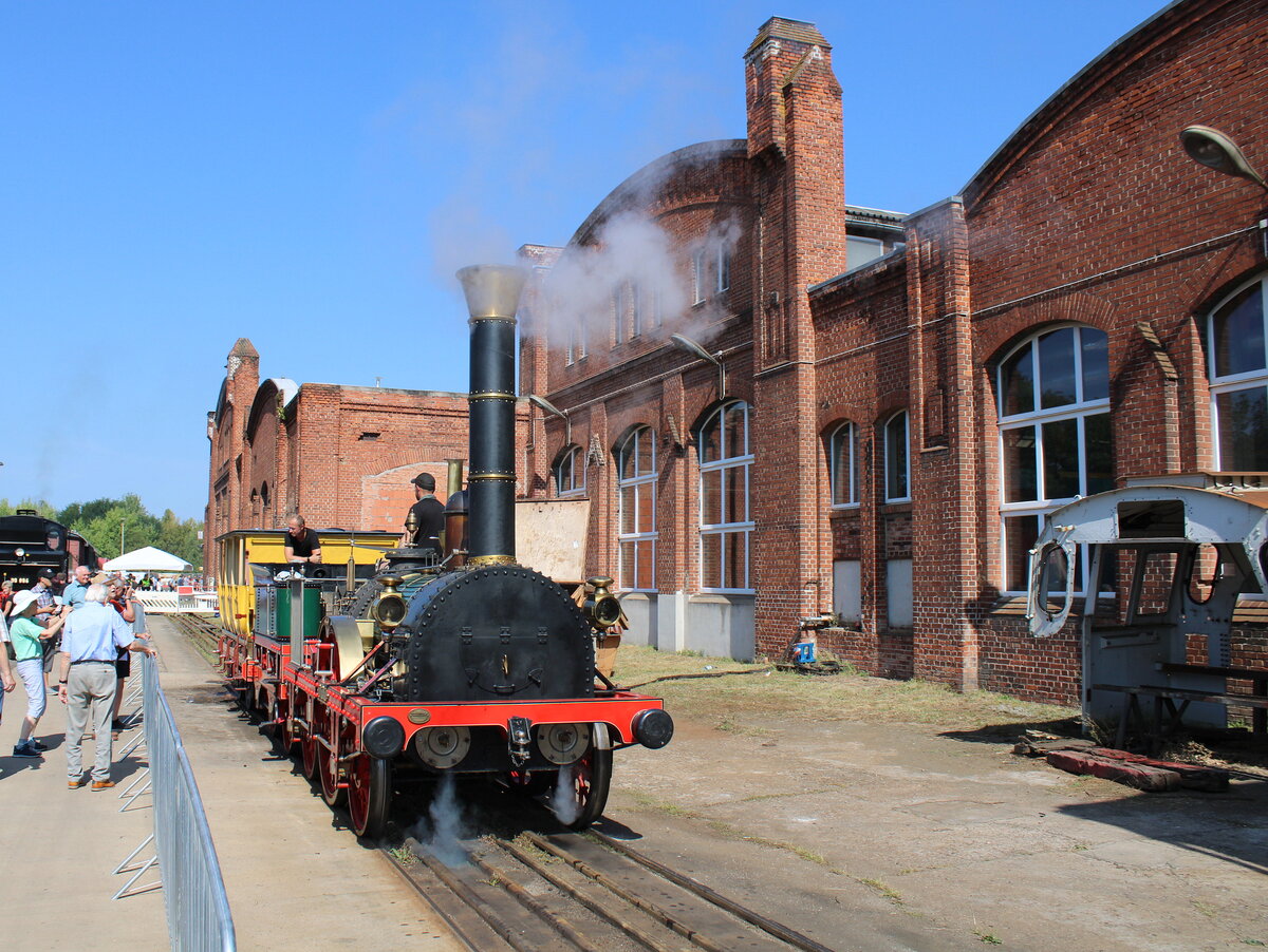 Der Nachbau der Adler Lok am 07.09.2024 auf dem Mehrschienengleis im Dampflokwerk Meiningen. Zu den Dampfloktagen durfte man in den 3. Klassewagen mitfahren.