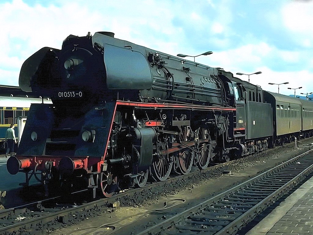 Die mächtige Dampflok 01 005, der erste Prototyp der für die DRG neu entwickelten Einheitslokomotive, steht am 28.08.1990 im Bw. Magdeburg Hbf.