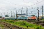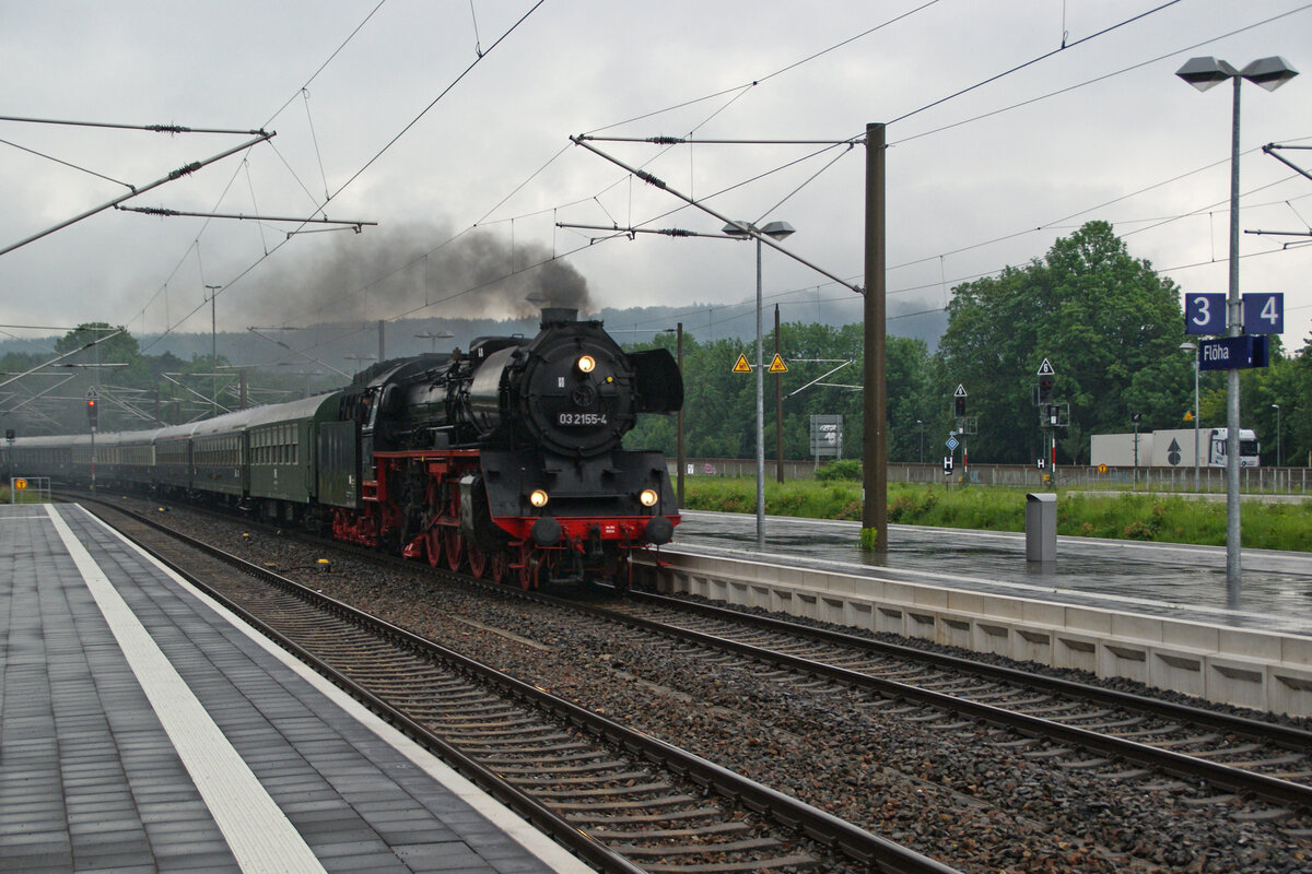 Hier zusehen ist 03 2155 am 2.6.24 mit dem Hagen von Ortloff Geburtstagssonderzug auf seiner Rückreise bei der Durchfahrt durch Flöha Richtung Chemnitz. Am Zugschluss hing 233 450.