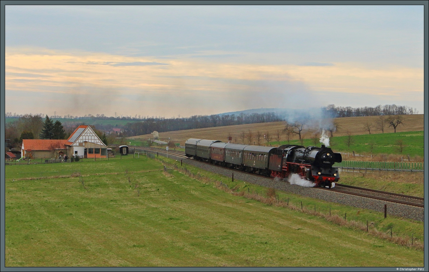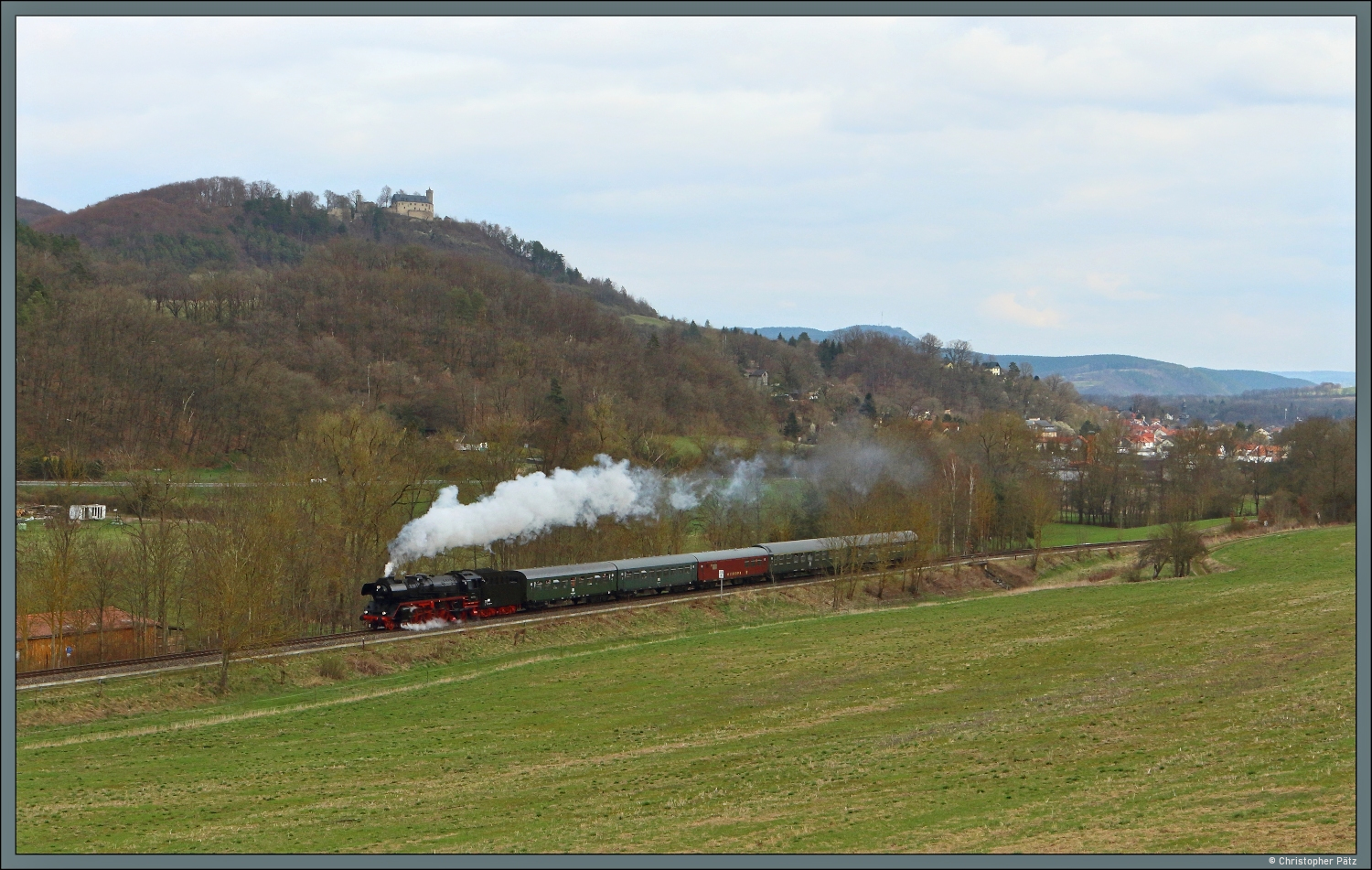 DAMPFWOLKEN rund um SAALFELD: Vom 27.03.2026 bis 06.04.2026 war Wedler & Franz Logistik wieder mit ihrer Dampflok 03 2155-4 in Thüringen unterwegs. Alle Fahrten starteten in Saalfeld/Saale. Hier ist WFL 03 2155-4 am 27.03.2026 nach einem Kreuzungshalt im Bahnhof Stadtilm auf dem dortigen Viadukt unterwegs. Der Zug hatte 10 Minuten Verspätung, aber die Fotowolke war pünktlich! Das Viadukt wurde vom 03.12.1891 bis 28.06.1893 erbaut und hat eine Gesamtlänge von 201,30 m, besitzt 13 Bögen und ist 18 m hoch. Es galt damals als eine der größten Eisenbahnbrücken. Die Schlußsteinlegung erfolgte am 28.6.1893 unter Anwesenheit des Fürstenpaares von Schwarzburg-Rudolstadt und weiteren Ehrengästen. Matthias Kümmel