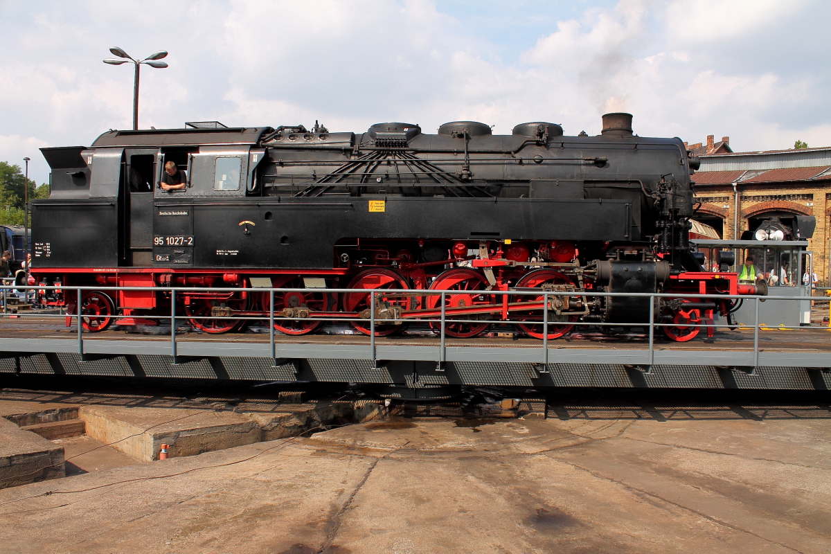 Die 95 1027-2 des Bw Arnstadt/hist. als Gast auf der Drehscheibe beim 10. Berliner Eisenbahnfest im Bw Berlin Schöneweide am 31.08.2013.