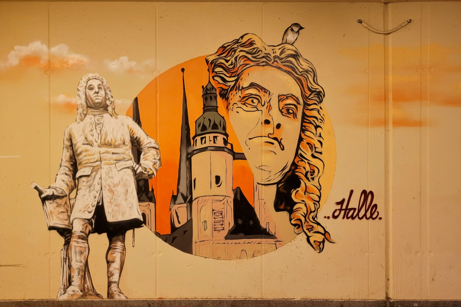 Händel im Vorharz: Bei der Neugestaltung der Bahnhofsunterführung in Aschersleben wurden verschiedene Motive an die Wände gemalt, unter anderem auch von Sachsen-Anhalts größter Stadt Halle (Saale).