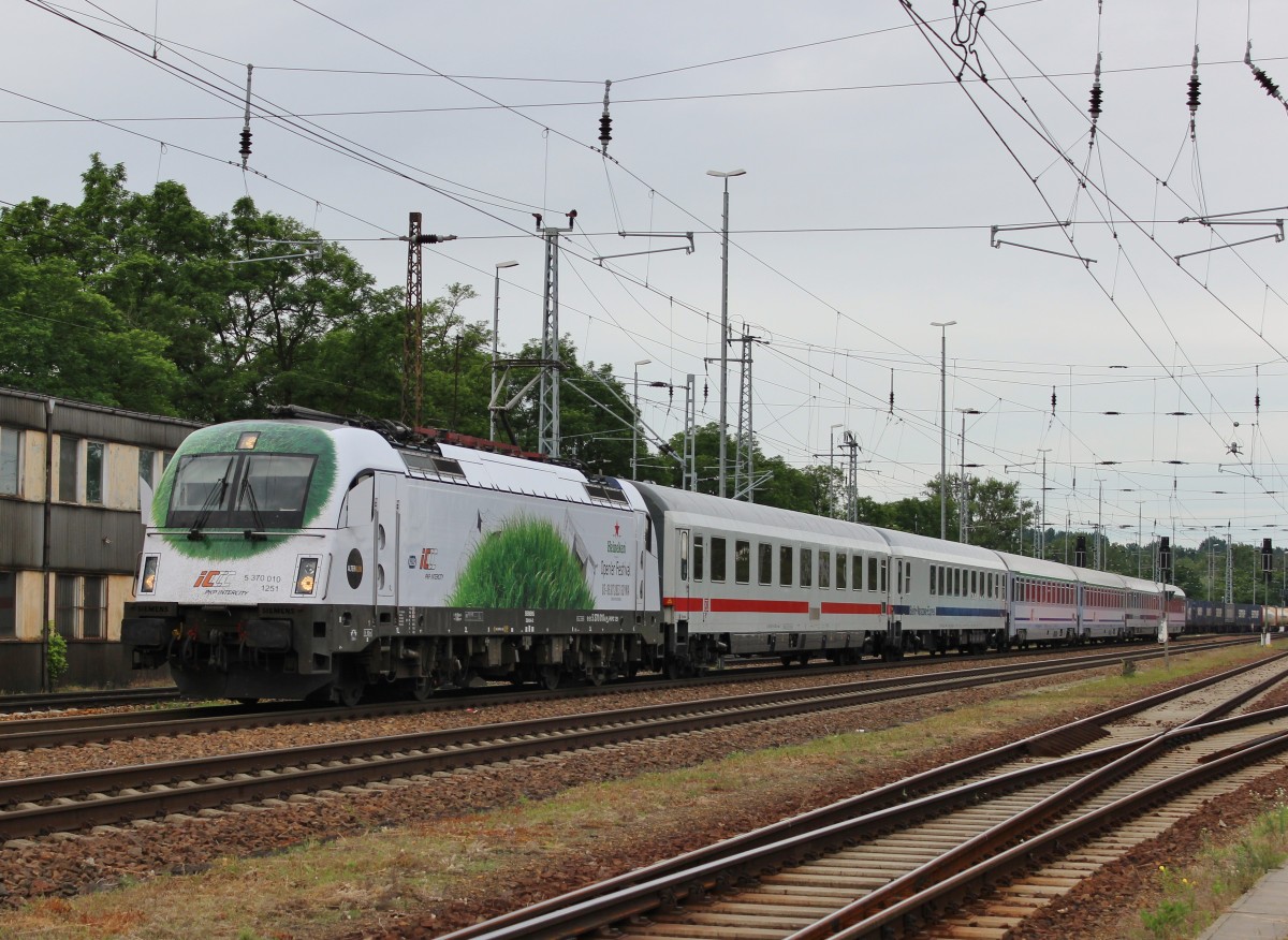 Am 24.Juni 2013 erreichte höchstwahrscheinlich zum letzten Mal mit dieser Werbung 5 370 009 "PGE Arena Gydansk" mit einem EC die Frankfurter Oderbrücke in Richtung Berlin Hbf.