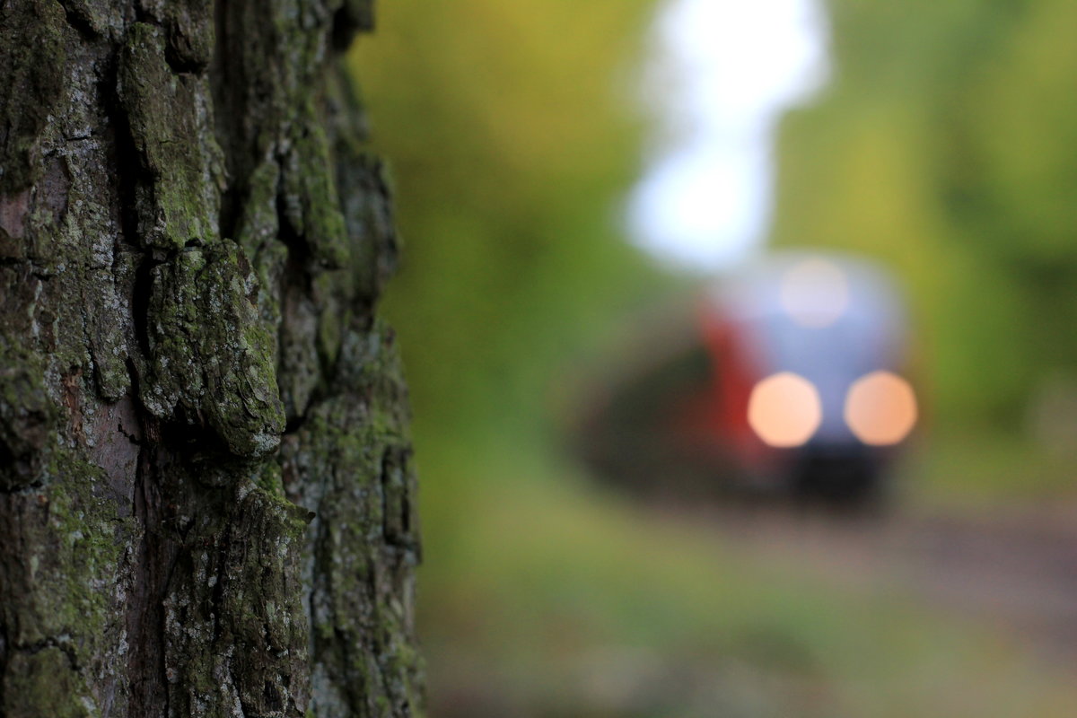 Eine im Prinzip interessante Idee, die meiner Meinung nach noch etwas aufgewertet werden könnte, in dem im "scharfen" Bereich entweder etwas bahnspezifisches zu sehen ist (statt einen Baumstamm z.B ein Signalmast) oder irgend ein Tier den Baumstamm hinauf krabbelt.
