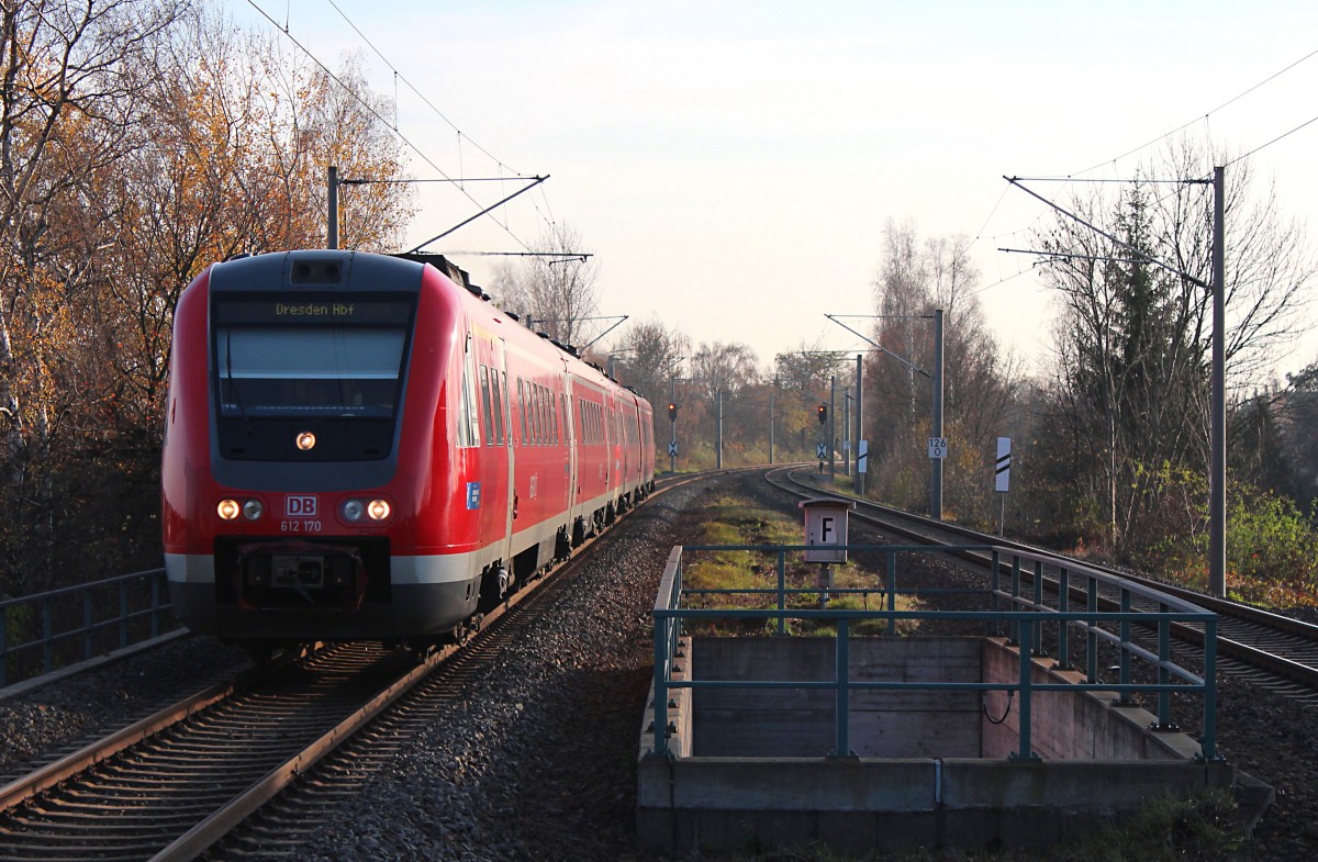 Am 22.11.2014 fahren 612 170 und 612 060 mit dem RE 3453 nach Dresden Hbf durch Zwickau-Pölbitz. Bis zur Deadline sind es noch 20 Tage, danach werden diese Triebzüge von der KBS 510 verschwinden.