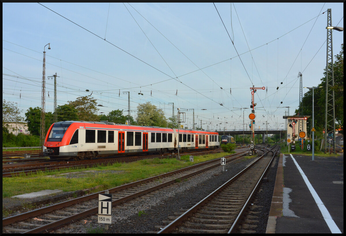 NEUMÜNSTER, 01.09.2023, 622 157 der AKN als A2 nach Norderstedt Mitte und 445 026 der DB im Schleswig-Holstein-Design als RE70 nach Hamburg-Altona, beide bei der Ausfahrt