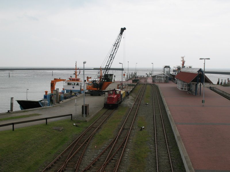 26.07.2007: Kö 1 der Inselbahn Langeoog vor einem Güterzug im Hafenbahnhof der Insel während der Beladung, links am Anleger das Güterschiff aus Bensersiel