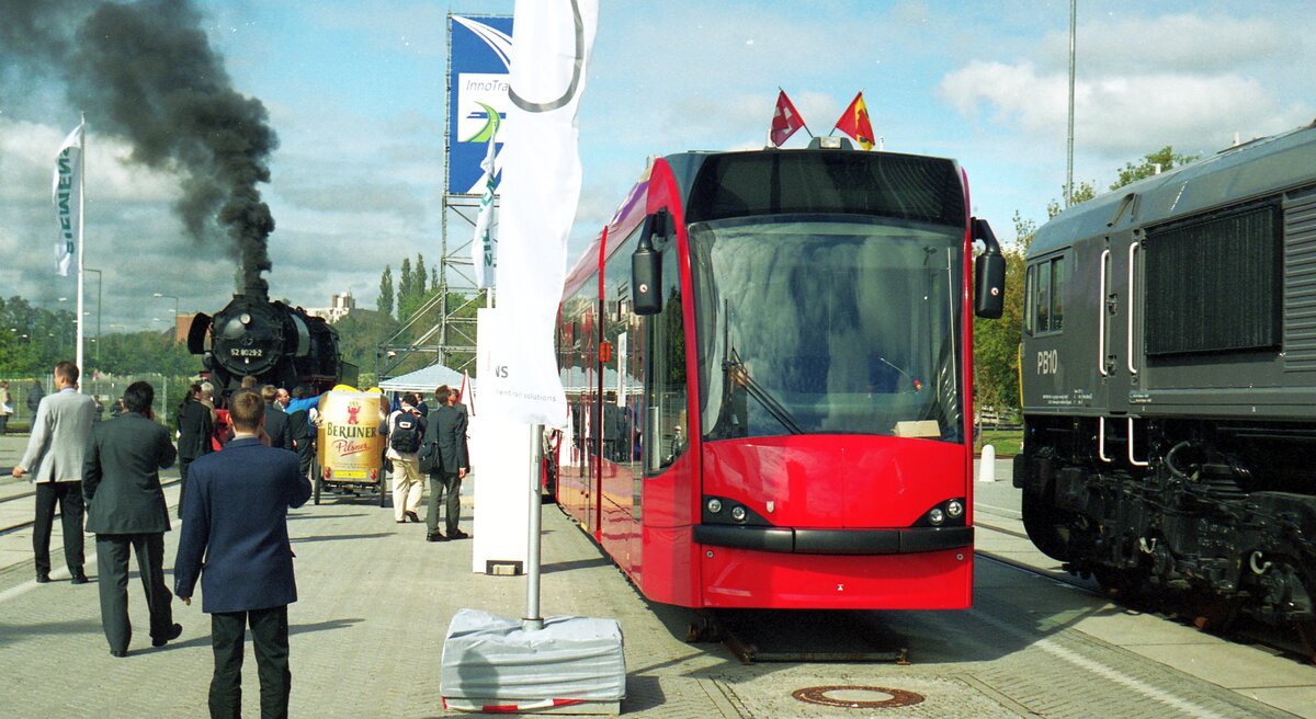 InnoTrans 2002__52 8029-2 von 1944 vom heute nicht mehr existierenden Eisenbahnverein 'Hei Na Ganzlin e. V.' und Combino Advanced für die Verkehrsbetriebe Bern.__09-2002