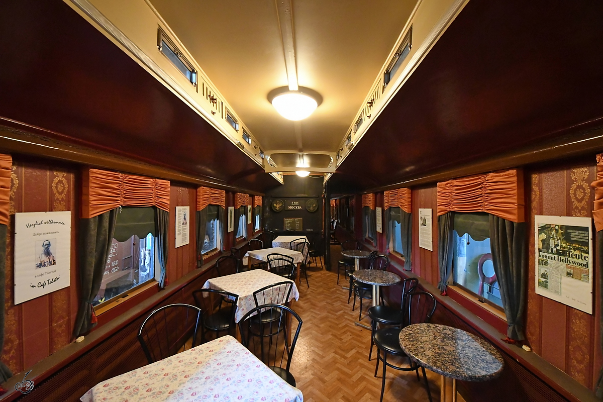 Blick in einen 1920 gebauten Schnellzugwagens, welcher Anfang August 2020 in der Lokwelt Freilassing zu sehen war. Zu erkennen ist die 2. (Polster)klasse, dahinter befindet sich die 3. (Holz)klasse.