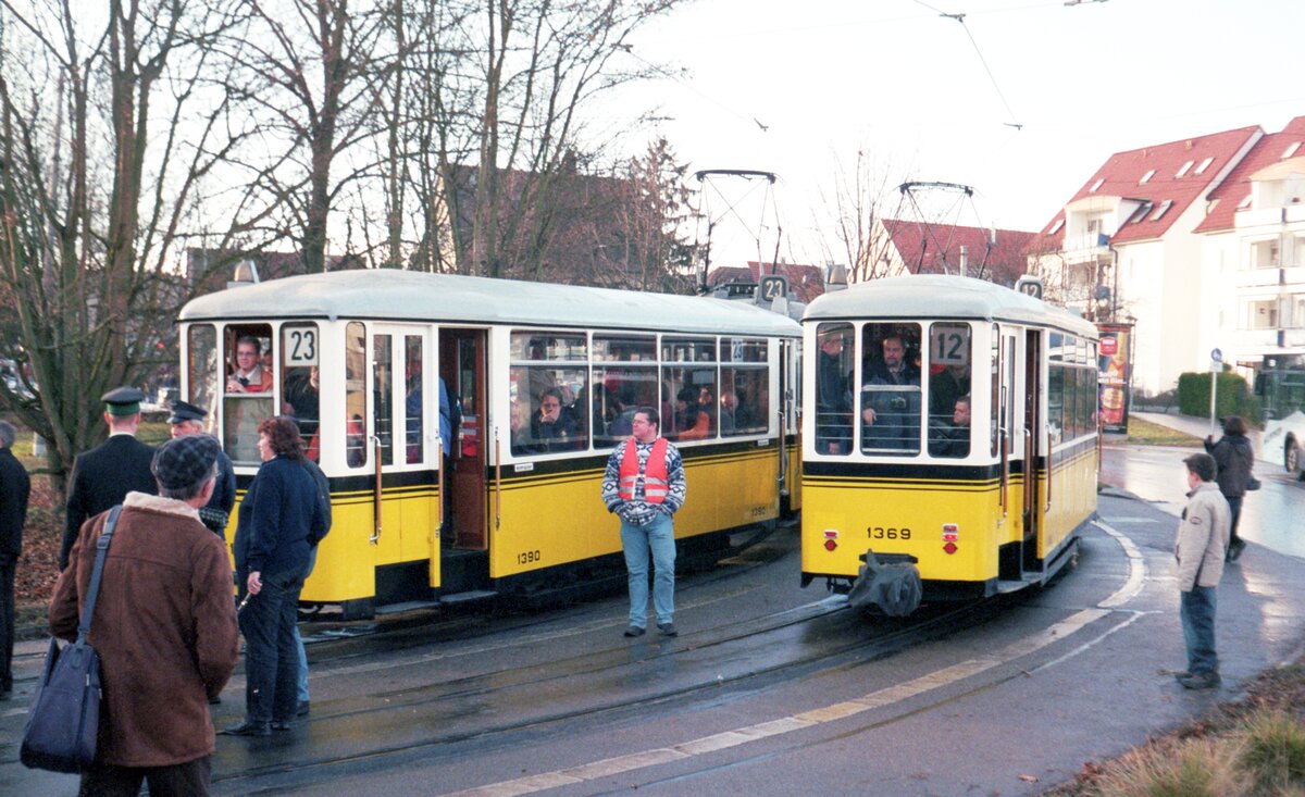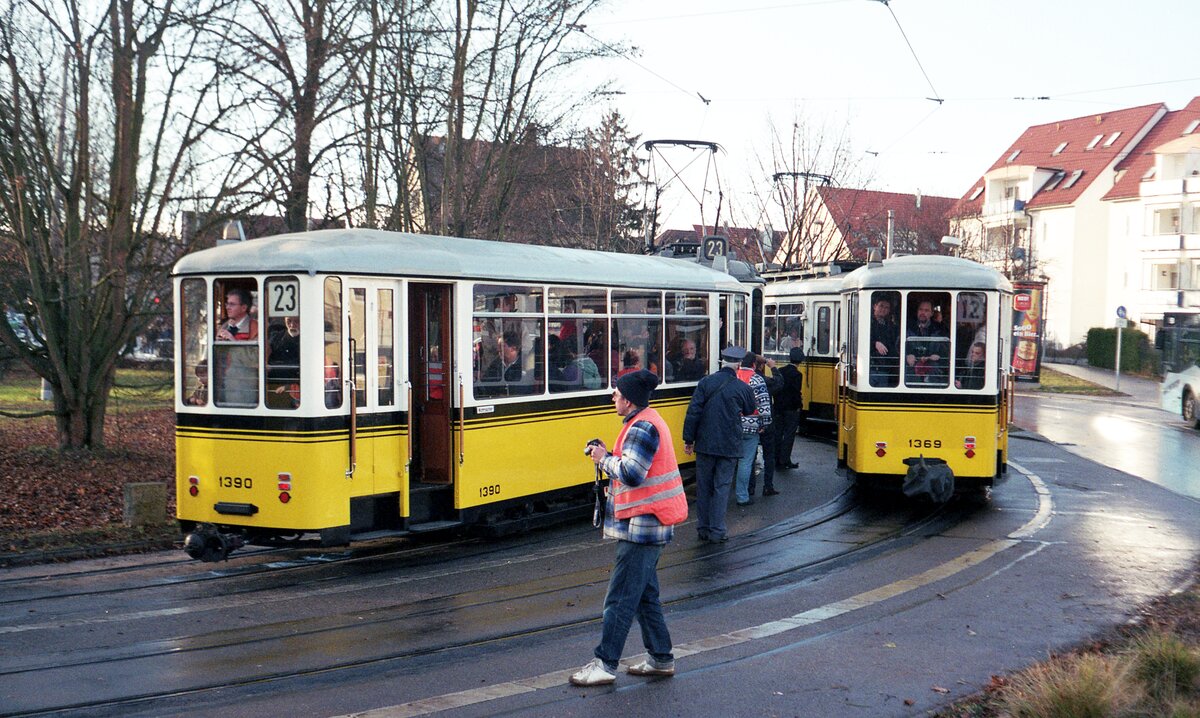 Das Gerlinger Straßenbahnmuseum ist leider auch schon im Zuge des Stadtbahnbaus verschwunden. Das vorherige Bw Gerlingen (SSB) war bis 1985 eine Außenstelle des Bw Feuerbach. In der Mitte etwas versteckt befindet sich TW 340 (Herbrand Serie 300, zuvor Straßenbahn Reutlingen). Wer weiß etwas über den Straßenbahn-TW vorn? (1988)
