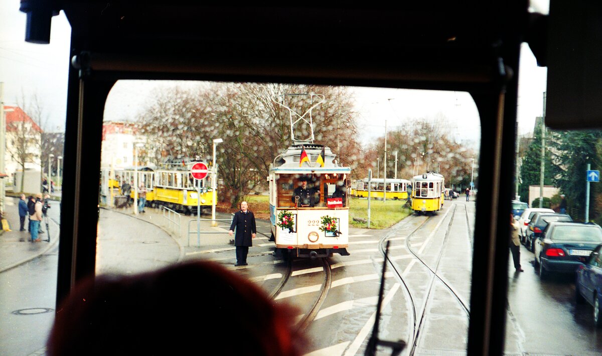 SSB Stuttgart__Umzug der SHB Museumswagen aus der Wagenhalle Zuffenhausen ins Straßenbahnmuseum Cannstatt. Das traditionelle Begleitfahrzeug steht vor der Halle Zuffenhausen bereit.Nach den ersten unerfüllten Hoffnungen des seinerzeitigen SMS (Straßenbahnmuseum Stuttgart e.V.) auf einen dauerhaften Museumsstandort, samt Überland-Strecke der 1978 stillgelegten END, in Nellingen Ende der 70er Jahre bis 1981, dann wohl nicht ernst gemeintem Interesse in Aalen für eine Teil-Reaktivierung der Härtsfeldbahn mit Museum auf dem dortigen ehemaligen Güterbhf.-Gelände, ab 1984 neuem arbeitsintensiven Engagement auf Vereinseigener Strecke samt Bahnhof der Steinachtalbahn in Schönau im Odenwald, kam dort das ‘Aus‘ Anfang der 90er Jahre. Der Nachfolge-Verein SHB (Stuttgarter Historische Straßenahnen) fand schließlich, nun dank der Unterstützung der SSB, ein Unterkommen in der Wagenhalle Gerlingen. Die beengten Verhältnisse erschwerten allerdings einen öffentlichen Ausstellungsbetrieb, so war man froh, ab Mitte 1995 im früheren Betriebshof Zuffenhausen das erste “echte“ Straßenbahnmuseum eröffnen zu können. Mit dem Ende des Meterspur-Linienbetriebs der SSB im Dezember 2007 wäre der Standort aber von den touristisch interessanten Strecken der Museumszüge zur Innenstadt und zum Fernsehturm abgeschnitten gewesen. So kam es zum letzten Umzug zur lang ersehnten endgültigen Bleibe im ehemaligen Betriebshof in Bad Cannstatt.__09-12-2007