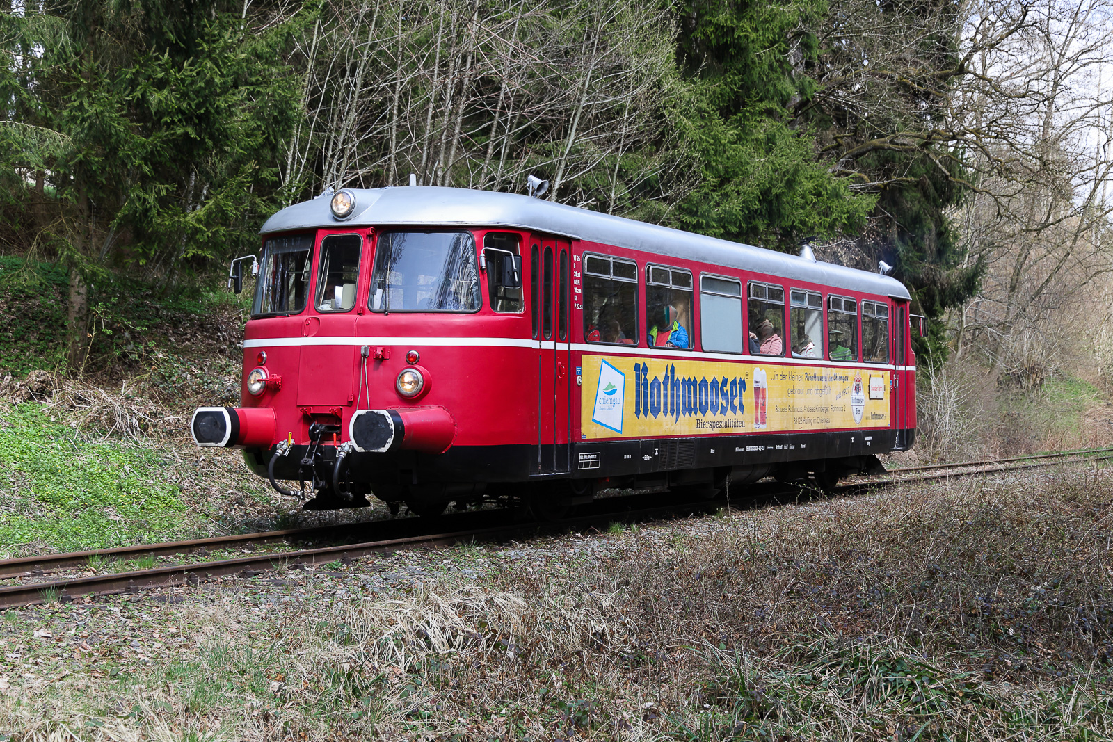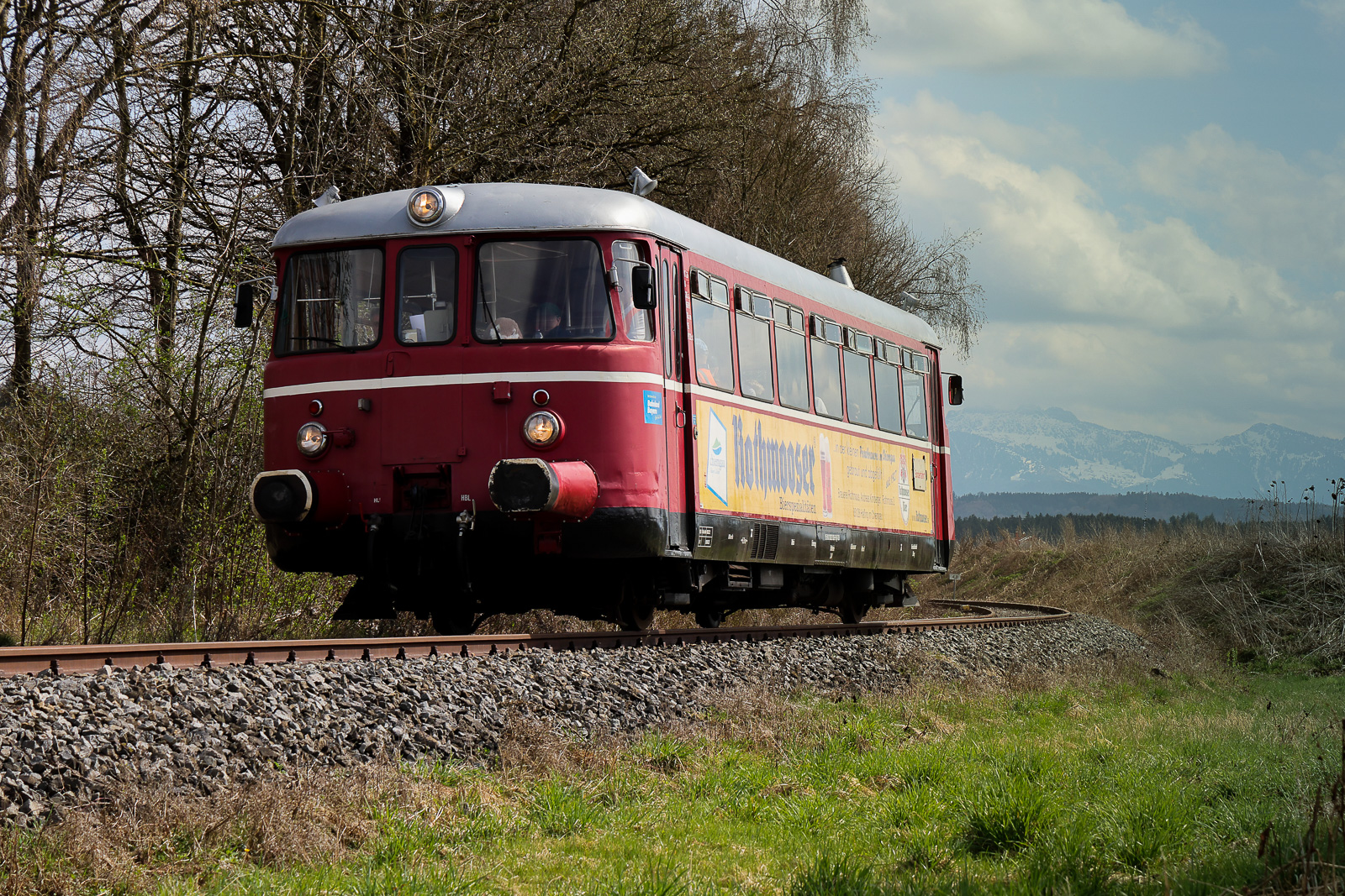 VT 26 mit der Nummer 95 80 0302 026-9 D CLB ist ein MAN Schienenbus der Chiemgauer Lokalbahn. Zu den Osterfeiertagen ging's von Obing nach Bad Endorf hin und her. Zwischen Bad Endorf und Halfing am 6.4.26 mit der Kampenwand im Hintergrund. Flo Weiss