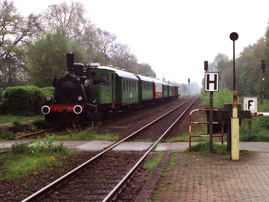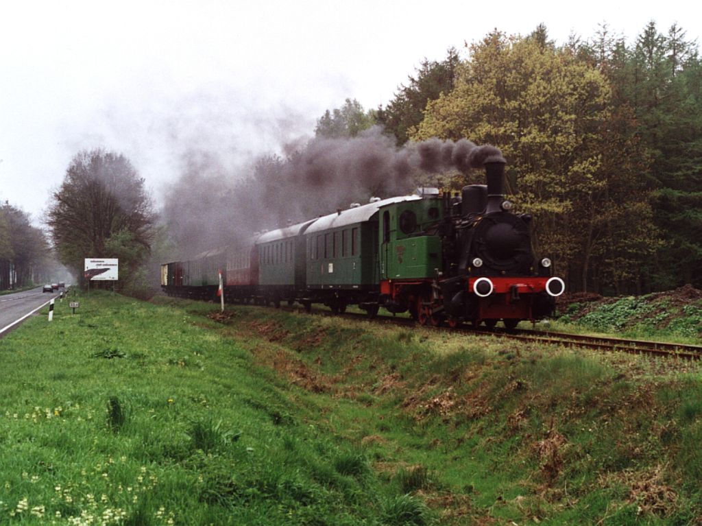 Die T3 mit eine Dampfzug zwischen Haselünne und Quackenbrück bei Ankunft in Bahnhof Essen (Oldenburg) am 29-4-2000. Bild und scan: Date Jan de Vries.