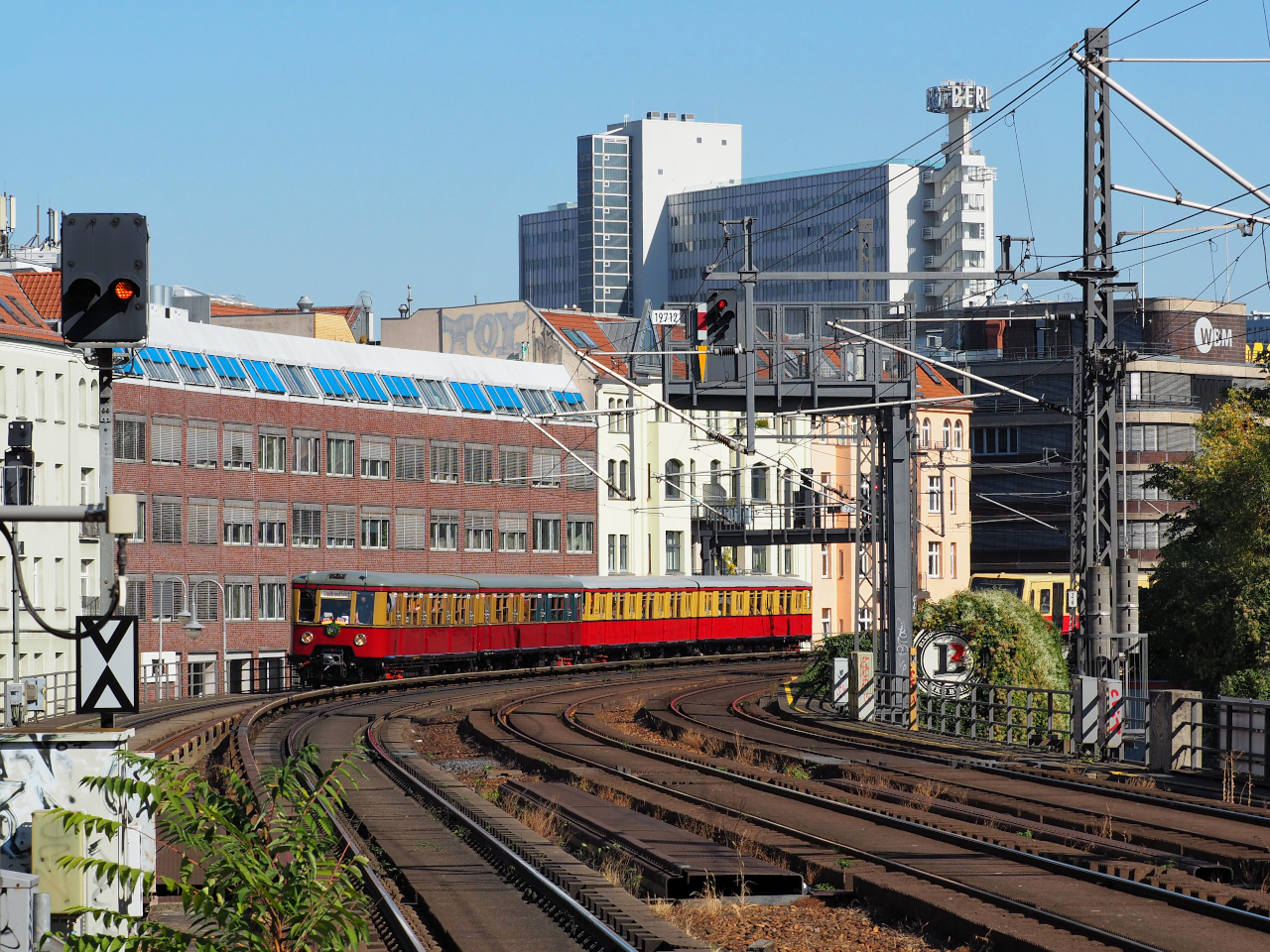 Der Verein "Historische S-Bahn e.V." hat zum Tag der Schiene 2024 eine Sonderfahrt über die Stadtbahn von "Warschauer Straße" bis Spandau und zurück durchgeführt. Auf der Hinfahrt konnte ich ihn zwischen Alexanderplatz und der Station "Hackescher Markt" einfangen, zum Glück ohne Gegenverkehr.
