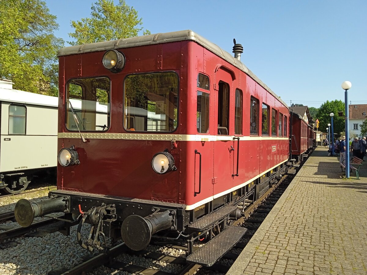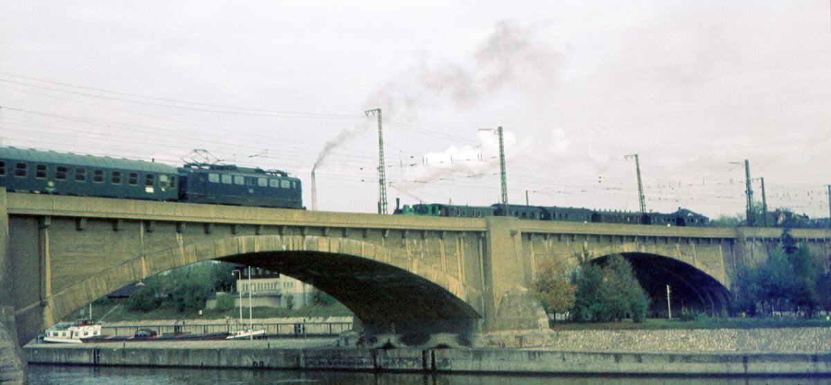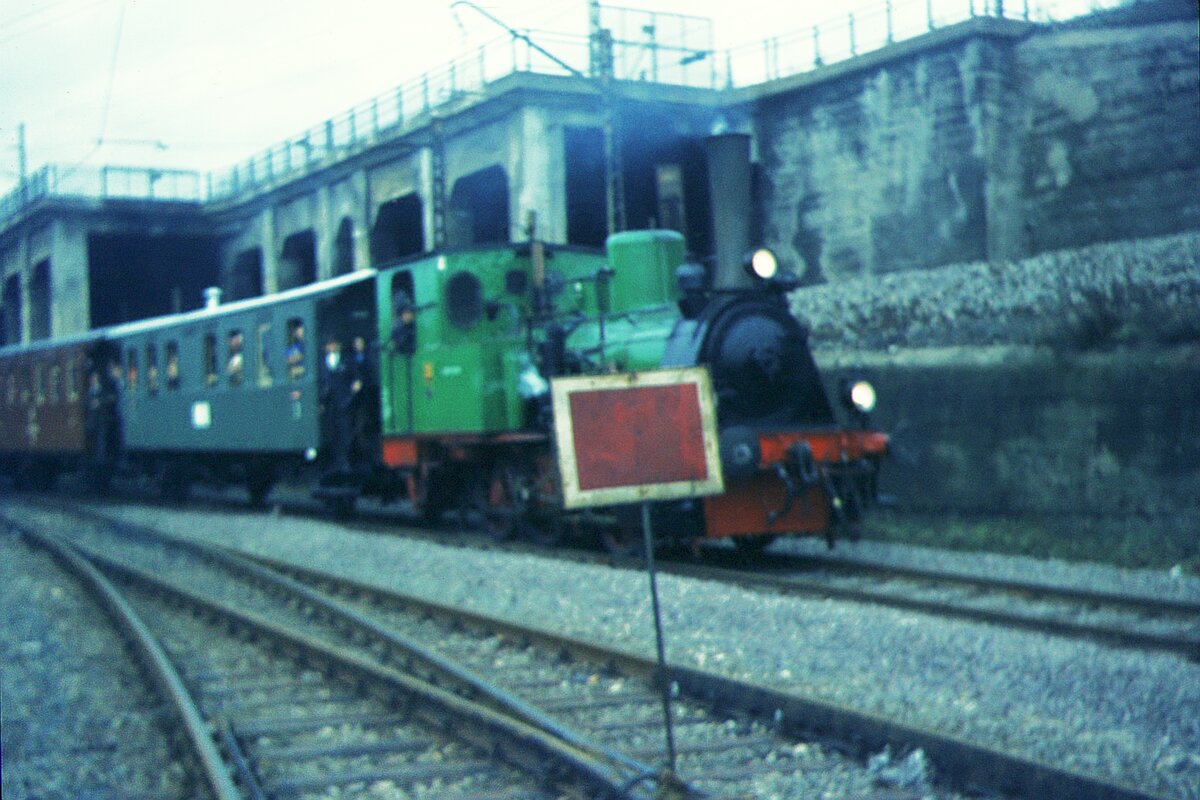 Shuttle-Service zw. Hbf Stuttgart und AW Cannstatt zum Tag der Offenen Tür. Begegnung des Dampfzugs mit Lok 30 [Borsig 1904 als Baulok für Strecke Biberach-Oberharmersbach, ... 1955 Kandertalbahn, 1966 EUROVAPOR, Kandertalbahn]. Begegnung mit E10-geführtem Zug auf der Rosensteinbrücke.__24-10-1970