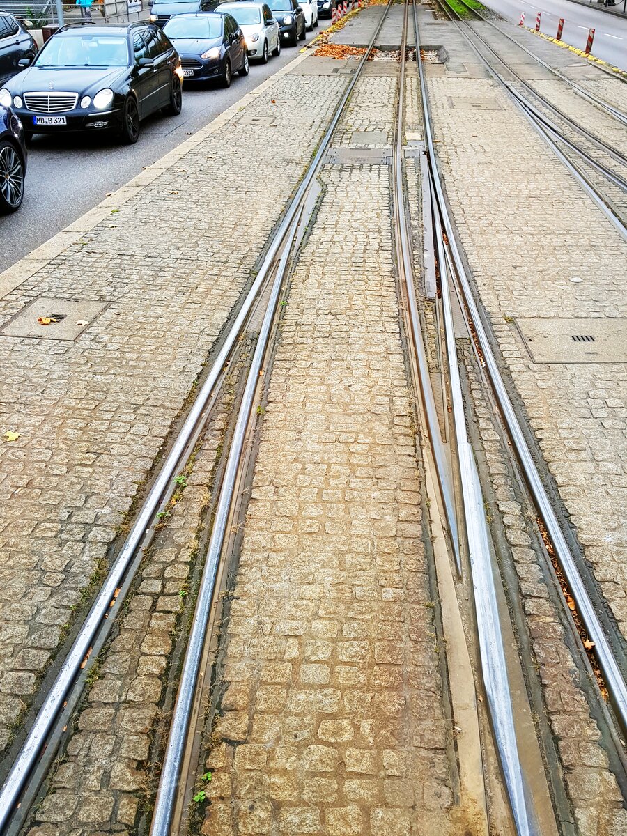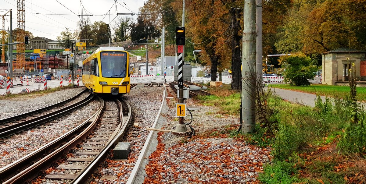 SSB Stuttgart__Dreischienen-Gleisabschnitte__Dreischienengleise mit M- und N-Spur, und entsprechend aufwendigen Weichen, gab es in Stuttgart "schon immer", auf der Filderbahn zwischen S-Vaihingen und S-Degerloch sowie S-Plieningen (anfangs bis Hohenheim) für den M-spurigen Personen und N-spurigen Güterverkehr. Im Bf S-Möhringen gab es interessante Weichen- und Kreuzungssituationen. Dann gab es viele Jahre während des Übergangs von Straßen- auf Stadtbahn gemischte Streckenabschnitte mit beiden Spurweiten. Mit Verabschiedung der letzten Meterspur-Linie 15 im Dez.2007 waren die Meterspurschienen obsolet. Im ganzen SSB-Netz ? Nein, ein kleiner Rest, von unbeugsamen Enthusiasten bewahrter, besonders reizvoller Strecken wird weiterhin im Dreischienenverkehr von Museums-Zügen befahren. So wie hier die abbiegende Strecke, von der Wilhelma kommend Richtung Löwentor und weiter bis Fernsehturm, von der Oldtimerlinie 23. Geradeaus geht's hier nur für die Stadtbahn (U14) nach Mühlhausen.__27-10-2019 Klaus-Erich Lisk
