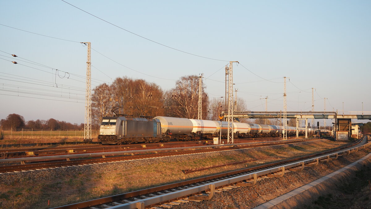 Ein 485er-Halbzug auf der S8 nach Birkenwerder bei der Ausfahrt aus Schönfließ.