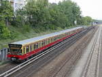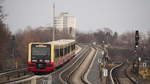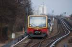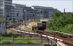 Ein Zug ("Wieder flott 13") auf der S47 fährt die Rampe zum Ring herunter. Im Hintergrund der Neubau des Estrel Towers. Aufgenommen an der Station "Neukölln".