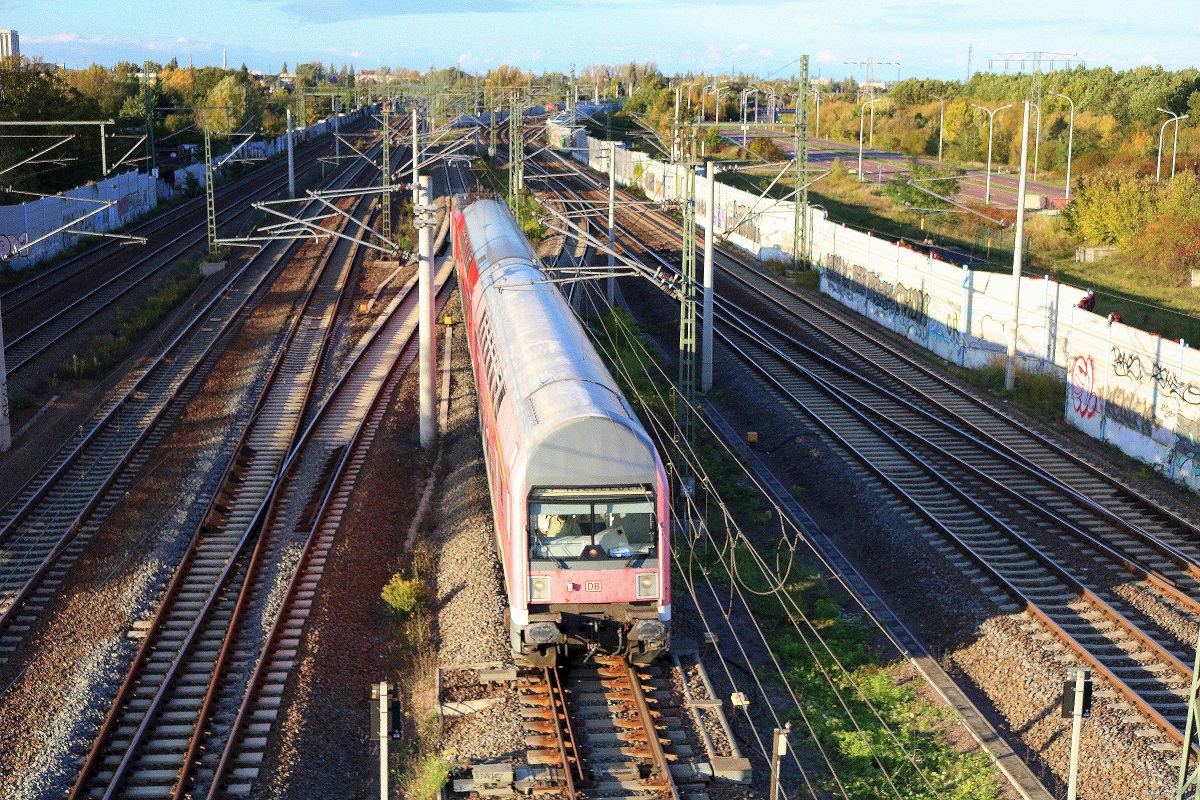 DABbuzfa 760 mit Schublok 143 903 der S-Bahn Mitteldeutschland (DB Regio Südost) als S 37750 (S7) von Halle(Saale)Hbf Gl. 13a nach Halle-Nietleben passiert den Abzweig Thüringen (At). Aufgenommen von der Brücke Dieselstraße in Halle (Saale). [3.10.2017 | 17:27 Uhr]