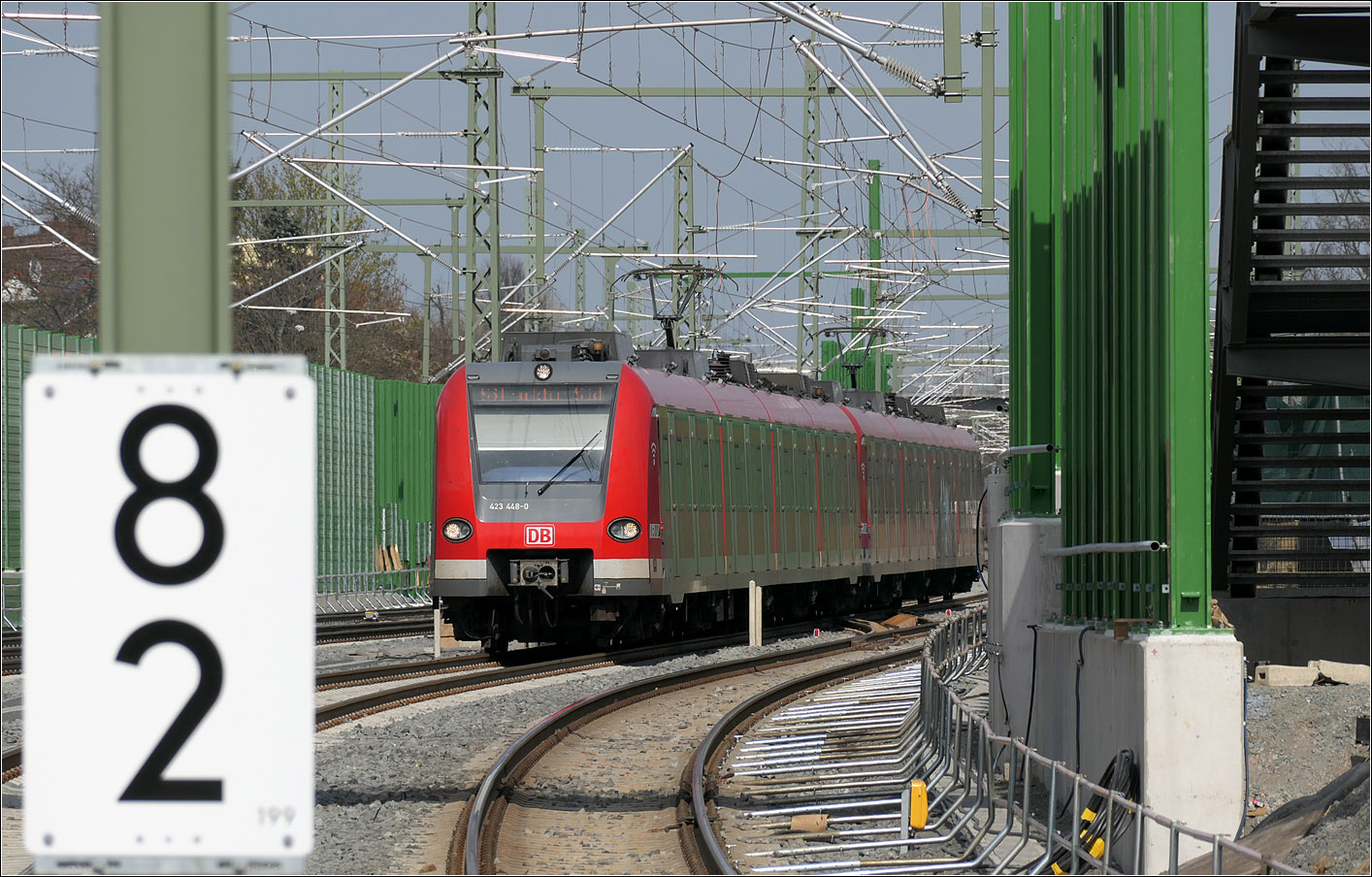 Einfahrt von 423 448-0 führend in die Station Frankfurt-Eschersheim.