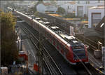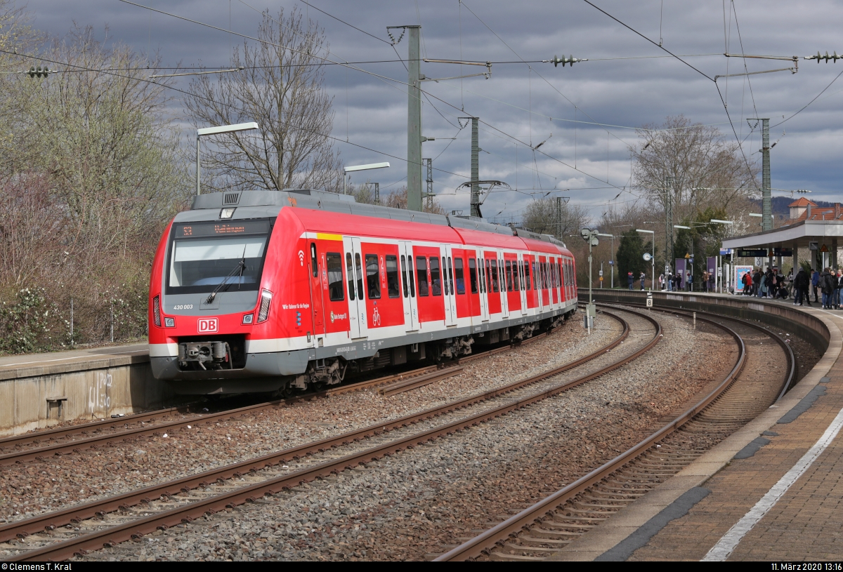 430 003-4 und 430 008-3 der S-Bahn Stuttgart als S3 von Backnang nach Stuttgart-Vaihingen verlassen den Bahnhof Waiblingen auf Gleis 1.