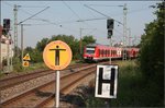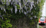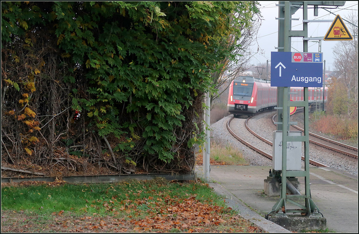 ... vorbei führen die Gleise in die S-Bahnstation Rommelshausen. Diese Wand aus den 1990iger Jahren ist ein Rankgerüst aus Stahl und Stahlseilen, die die Bushaltestelle und die Durchgangsstraße von einer kleinen Wiese neben dem Bahnsteig in Richtung Schorndorf.