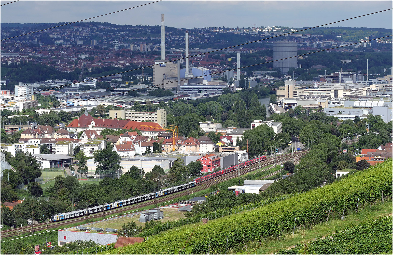 ... während das hoch industrialisierte Neckartal auf der Sonnenseite liegt. Zwei S-Bahnzüge auf der S1 begegnen sich südlich des Bahnhofes Untertürkheim. Der Killesberg oben links hat wiederum auch etwas Sonne.