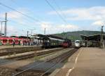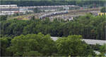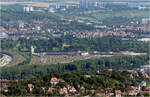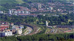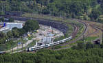 Ausblick vom Jubiläumsturm beim Stumpfenhof hinunter ins Neckartal zu den abgestellten S-Bahnzüge im Betriebshof und einem auf der Filsbahn fahrenden ICE 4.
