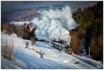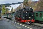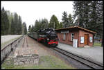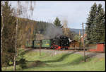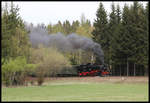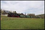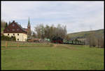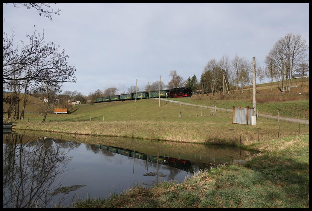 Nahe Hammerunterwiesenthal ist hier am 26.4.2019 um 8.29 Uhr die 991782-5 mit dem ersten Personenzug des Tages von Oberwiesenthal nach Cranzahl unterwegs. Im Wasser eines Fischteiches spiegelt sich der Zug im Wasser.