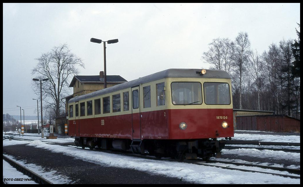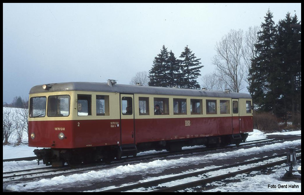 Am vereisten Bahnsteig wartet am 9.2.1997 der HSB VT 187012 auf Fahrgäste im Bahnhof Stiege.