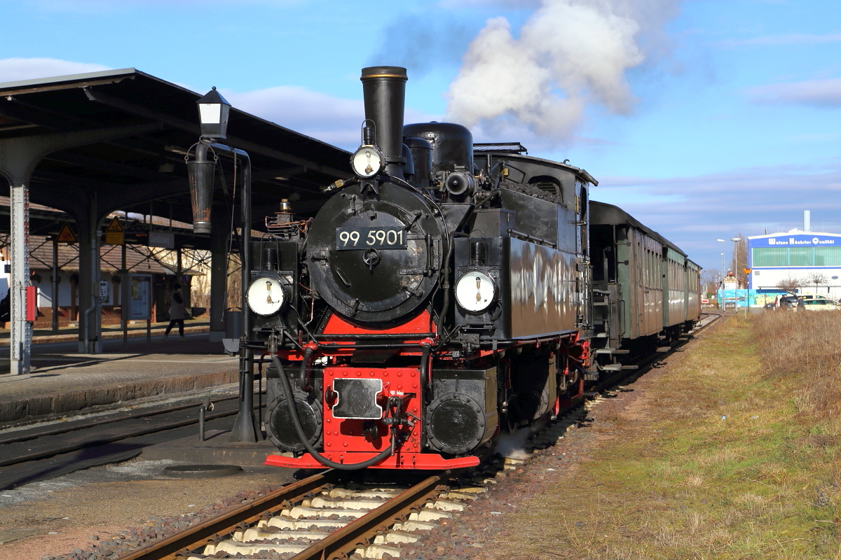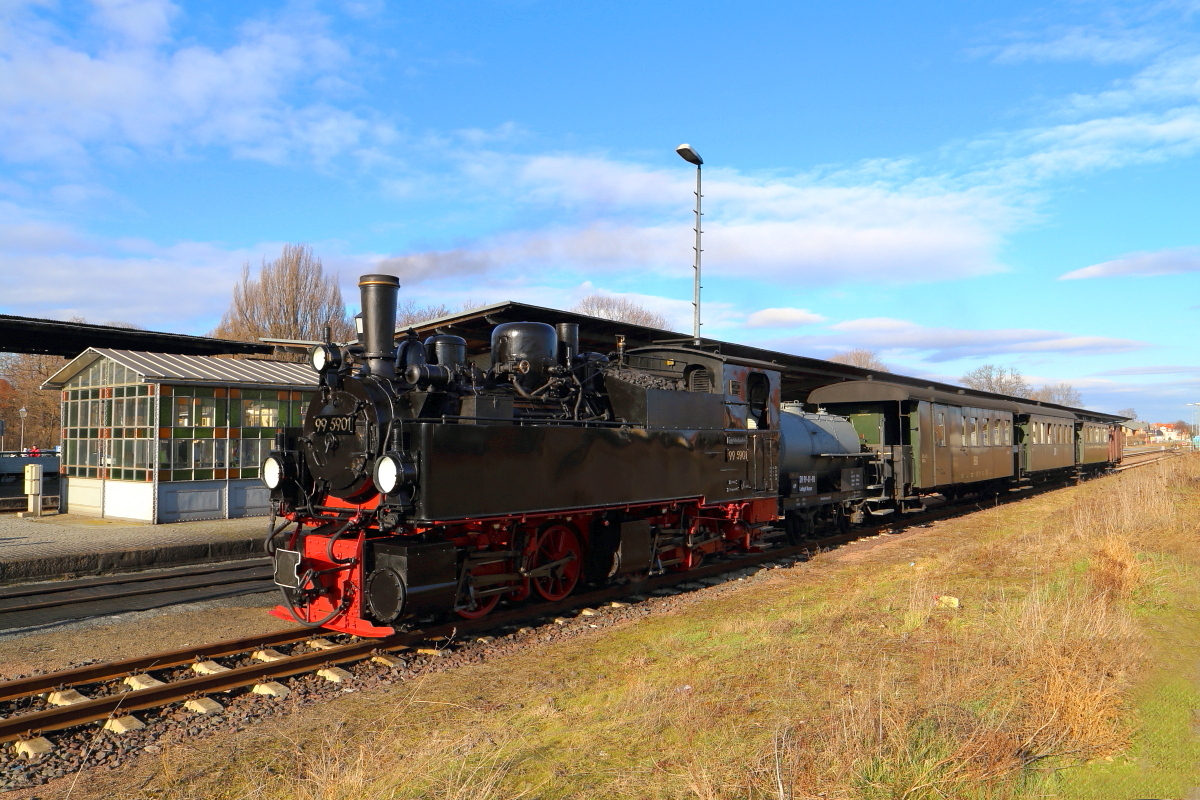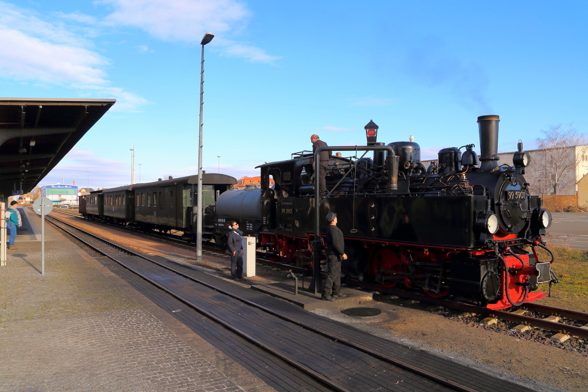 Während 99 5901 am Vormittag des 26.02.2017 im Bahnhof Drei Annen Hohne Wasser nimmt, wird durch das Lokpersonal eine kurze Inspektion der alten Lady vorgenommen. (Aufnahme im Rahmen eine Sonderzugveranstaltung der IG HSB)